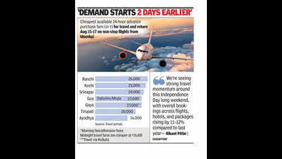 Mumbai: The mid-Aug holidays—Independence Day, Janmasthami and Parsi New Year—have been spiking the demand for air travel for quite some years now, and the trend has stayed strong this time too. With Aug 15 falling on a Friday, the extended weekend holidayers seem to have booked their short trips as airfares to leisure and religious destinations have peaked for the coming weekend.The most noticeable change is on the Mumbai-Goa route. Airfares on the most popular non-metro destination out of Mumbai had cooled in the recent past with two airports in Goa offering travel options. But this year, if you want to fly out on Friday morning or noon to Goa and return by a noon or evening flight, you will have to shell out Rs 23,000. The cheapest fare on the route is Rs 15,000, but that would give you red-eye flights that depart or land around midnight. Last year, the cheapest 24-hour advance purchase fare to travel from Mumbai to Goa started at Rs 15,000, for convenient timings.In 2024, Aug 15 fell on a Thursday, but with Rakshabandan falling on Aug 19, in 2024, the mid-Aug long weekend stretched to five days. This year, the Aug 15 long weekend is only 3 days long. Leisure travel and religious tourism have peaked with fares to Kochi, Gaya, Ayodhya, Agra up. For instance, while the Mumbai-Kochi return fare is priced at Rs 12,000 for the Aug 22 weekend, it is Rs 25,000 for the Aug 15 weekend.‘Visiting friends and relatives’ or VFR destinations don’t go up in demand mid-Aug. A return ticket to fly non-stop from Mumbai to Kolkata starting at Rs 14,000 thus is a cheap option and so is a Rs 13,000 return for a Mumbai-Delhi flight.Rajesh Magow of MakeMyTrip said: “Independence Day has emerged as a key travel occasion over the years. This year too, the search and booking trends point to strong intent to travel over the Independence Day weekend. With Independence Day on a Friday, travel demand appears to be peaking two days earlier, on Wednesday, Aug 13, giving early travellers a 5-day window.” Among the trending domestic cities are Goa, Udaipur, Jaipur, Puri, Lonavala, Varanasi, Coorg, Mahabaleshwar, Ooty, and Puducherry, he added. The first half of Aug is shaping up to be a peak travel window, with travellers opting for quick escapes. Rikant Pittie of EaseMyTrip said destinations such as Udaipur, Goa, Mysuru, Kerala and Hyderabad are trending.