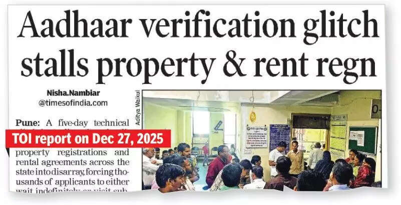 The registration office released a statement on Monday clarifying that the issue arose because of a technical glitch with the Windows server at DIT. The Inspector General of Registration (IGR)’s office has been doggedly following up with the department for a quick redressal. An official said services would resume at the earliest.A senior official from the state registration department said the technical glitch has disrupted Aadhaar-based online verification for property registrations wherein applicants either have to wait for restoration of the system or visit sub-registrar offices in person with two witnesses. Additionally, work for online leave-and-licence agreements has almost halted. The snag has also stalled e-registration of first sale of flats from builders’ offices, mainly in Pune and Mumbai, where Aadhaar authentication is mandatory and biometric verification of buyers has been failing.In 2018, Maharashtra revised Section 32A of the Registration Act, 1908, paving the way for Aadhaar-based property registration from March 2019. The move aimed to reduce footfall at sub-registrar offices and spare homebuyers the hassle of arranging two witnesses. The same system later enabled online leave-and-licence registrations and first-sale registrations directly from developers’ offices.Maharashtra has 519 registration offices, including 27 in Pune district, each handling an average of about 50 property registrations on a normal working day.With online verification down, citizens seeking to register rental agreements are also being directed to visit centres in person, leading to a sharp rise in footfall. Officials said the impact was felt most in urban centres, such as Pune and Mumbai, where a large number of registrations are processed digitally.President of the Association of Service Providers, Maharashtra State, Sachin Shingavi said, “We are hoping services resume soon,” he told TOI on Monday.Associations have submitted around 30 recommendations to streamline operations in case of such failures and suggested alternatives like email verification and biometric scanning.Citizens waiting at sub-registrar offices complained services were halted without prior notice and questioned why no offline alternative or helplines were arranged. They also wanted to know when a permanent solution would be found for these recurring glitches.