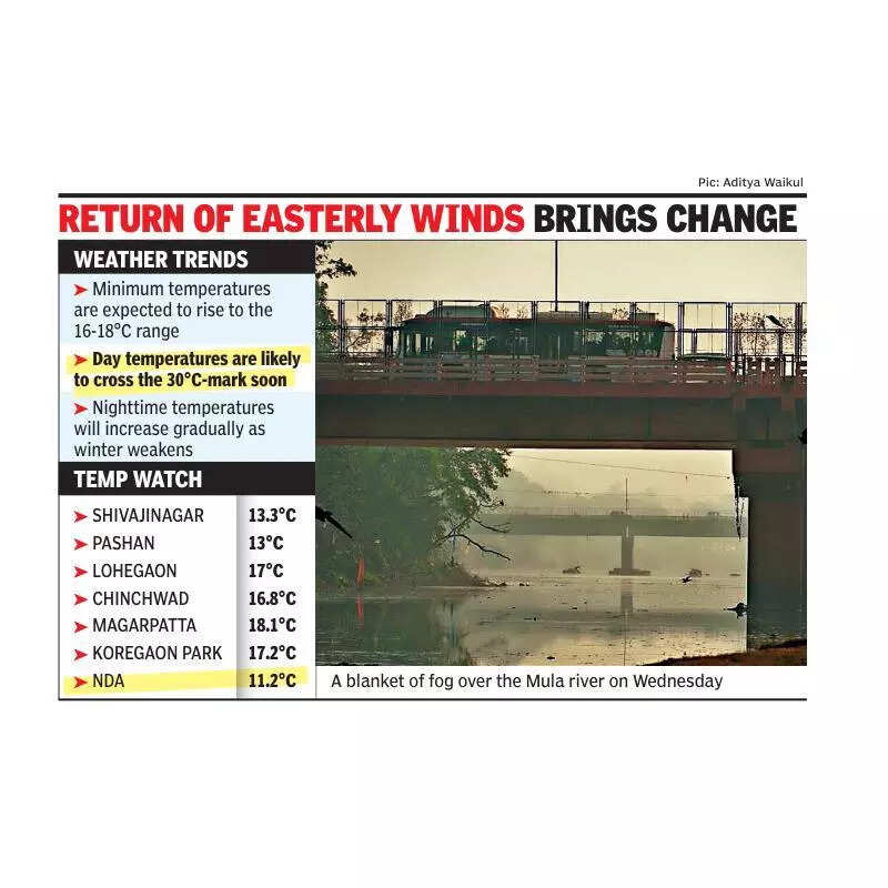 Daytime temperatures are also expected to climb. Pune’s maximum temperatures have remained below 30°C over the past few days, but IMD has indicated that they were likely to cross the 30°C-mark soon. Minimum temperatures are also expected to rise to the 16-18°C range. “We expect easterly winds to dominate over the next few days, and minimum temperatures are unlikely to dip into single digits during the next four to five days,” IMD scientist SD Sanap said. He said both daytime and nighttime temperatures were likely to increase gradually as winter weakens. “Minimum temperatures can rise by around 2-3 degrees over the next three to four days, after which conditions may remain largely stable for about a week. Any potential drop after that is uncertain at this point,” Sanap said.He said minimum temperatures across much of Maharashtra stayed 2-3 degrees above normal this Jan, in contrast to Dec, which witnessed significantly colder nights. “Cold and dry winds over the state have weakened. We are also seeing increased moisture and partly cloudy skies,” Sanap said.Independent weather forecaster Abhijit Modak echoed similar views, saying as the recent western disturbance moved away, easterly winds were expected to return. “This will lead to a gradual rise in maximum temperatures across Konkan, with coastal areas warming to around 31-33°C, while interior regions may see temperatures between 34°C and 36°C till Jan 22. Minimum temperatures are also likely to increase between Jan 21 and 23,” he said.“At this stage, there is no indication of single-digit minimum temperatures,” he added.Speaking on the larger weather pattern this Jan, Modak said the expected western disturbance remained weak and lacked the intensity required to significantly affect Maharashtra. “That is why we are not seeing any major cold spell,” he said.Modak attributed Pune’s geographical location as a limiting factor for extreme cold. “Pune lies at southern latitudes, where western disturbances mainly impact minimum temperatures rather than maximums. Only a very strong system can trigger sharp drops. It is only under such conditions that temperatures fall to five or six degrees Celsius,” he said.