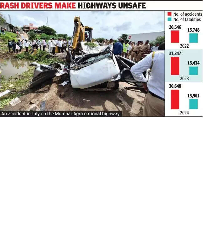 Pune: A recent CID study in the state has said reckless driving and disregard for traffic rules have largely contributed to the high number of fatalities in road accidents between 2022 and 2024 .In 2024, there were 15,901 deaths in 30,648 road accidents. The number was up by almost 500 from 2023 when 31,347 road accidents led to 15,434 deaths. In 2022, 20,546 accidents had caused 15,748 fatalities.Last year, state’s highest number of deaths in road accidents occurred in Nashik rural at 1,016, followed by 967 in Pune rural. Police said highways crossing rural and city areas see numerous mishaps and loss of lives.Additional director general of police (CID) Sunil Ramanand told TOI: “In coordination with the civic administration, police are taking measures to improve road infrastructure and reduce fatal accidents. However, the major cause of concern is reckless and thoughtless driving by motorists.”He said, “Fatalities were more in districts with major highways passing through the jurisdictions. Fewer accidents and related deaths were seen in smaller districts.”Highway Safety Patrol Pune’s superintendent of police Vikrant Deshmukh told TOI: “The number of accidents is higher in rural areas where two-wheeler riders without helmets on highways are the main victims. Additionally, in case of four-wheelers, passengers do not wear seat belts and this is unsafe.”Deshmukh further said a major cause of worry is rash movement of trucks and other four-wheelers on state and national highways, especially along the Ahilyanagar-Kalyan and the Pune-Nashik highways — which have seen some major accidents. “Moreover, a single accident involving a bus or SUV on highways in rural areas results in multiple deaths,” the officer said.Lastly, there are several infrastructure issues on state and national highways. Deshmukh said, “Our teams visit spots of fatal accidents and study it with the help of the state public works department. We are repairing illegal entry-exit ways, reducing black spots and constructing medians, etc, to change the situation.”Director of Save Pune Traffic Movement Harshad Abhyankar said, “There is many a factor for increasing accidents on highways. On the other hand, cities witness regular traffic jams and motorists hardly get space to speed. This is a boon since it may prevent major mishaps.”“In comparison, highways have high speed limits and there are barely any traffic snarls. Vehicles move fast and collisions, if any, are dangerous. New vehicles have powerful engines, reaching a high speed within seconds. Unfortunately, the drivers are often irresponsible. Authorities should be careful while sanctioning drivers licence and give it only after thorough examination,” Abhyankar said.GraphicsYear – No. of Accidents – No. of Fatalities2022 – 20,546 – 15,7482023 – 31,347 – 15,4342024 – 30,648 – 15,901