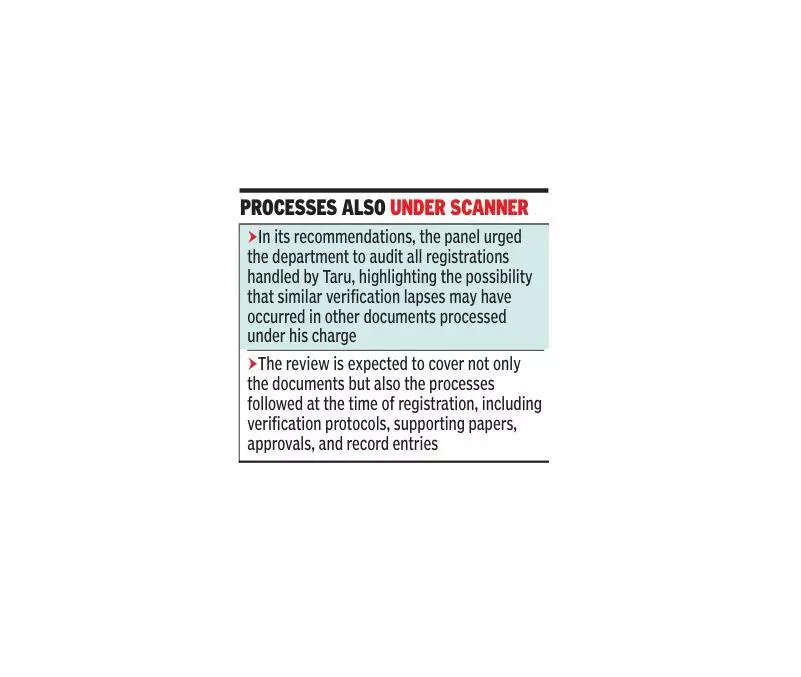 Pune: After a five-member panel flagged serious lapses in the 40-acre Mundhwa land deal, the state registration department on Tuesday ordered a full audit of all registrations executed by suspended Haveli No. 4 sub registrar Ravindra Taru.The committee found major irregularities in the Mundhwa sale deed, including inadequate document verification and failure to follow mandatory checks. Acting on its recommendations, joint IGR Rajendra Muthe on Tuesday directed the joint district registrar, Pune city, to scrutinise every registration document cleared by Taru and identify any anomalies as per the instructions of the state IGR Ravindra Binawade.A sub registrar’s duties include registering various legal documents like property deeds and wills, collecting stamp duty and registration fees, and ensuring the legality and authenticity of transactions. They are also responsible for preserving original documents, issuing certified copies, and maintaining public records to provide legal proof of ownership and prevent fraud.A detailed report has been sought by Nov 30, as part of the department’s internal review following the controversy over the Mundhwa land deal. Officials from the joint district registrar’s office told TOI that Taru held charge for over two years at the same office and all the registrations signed by him will be checked. “The documents will be scrutinised for any violation,” officials said.The committee, constituted to examine the Mundhwa land parcel transaction, submitted its findings to the department. The report confirmed that the sale deed for the Mundhwa deal contained serious procedural irregularities. The deed was registered by Taru during his tenure at the Haveli No. 4 sub registrar’s office.According to officials familiar with the probe, the panel flagged multiple concerns, including inadequate verification of supporting documents, failure to properly examine ownership records, and lapses in cross-checking entries with revenue and land records. The inquiry noted that certain mandatory checks, which are required before accepting a document for registration, were not adhered to, resulting in a flawed registration process.Processes Also Under Scanner In its recommendations, the panel urged the department to audit all registrations handled by Taru, highlighting the possibility that similar verification lapses may have occurred in other documents processed under his chargeThe review is expected to cover not only the documents but also the processes followed at the time of registration, including verification protocols, supporting papers, approvals, and record entries