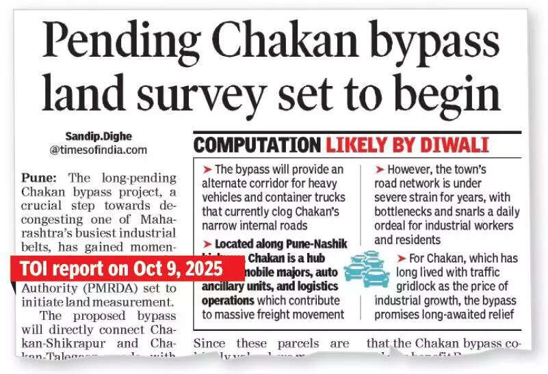 Pune: The land measurement process for the proposed 2.5km Chakan Bypass Road, designed to connect the Kadachiwadi–Chakan–Shikrapur road to the Medankarwadi–Pune–Nashik highway, began on Thursday. The project aimed to decongest the heavily traffic in the Chakan industrial belt.The bypass, planned to be 36 metre wide, is expected to cut through Kadachiwadi and Medankarwadi villages in Khed taluka. The Pune Metropolitan Region Development Authority (PMRDA) would oversee the project, officials said. The move followed a major protest march highlighting chronic congestion on the route last week.Officials said approximately 21 acres across the two villages would be acquired. The current land measurement marked the first step toward acquisition, after which landowners would receive notices. Consultations with affected farmers would then determine compensation rates. “The works and tenders will be announced before the model code of conduct comes into effect ahead of the local polls,” officials added.However, the survey met mild resistance from some Medankarwadi farmers, who argued the proposed alignment would split their landholdings. They requested that the road be realigned along the adjacent stream instead. Officials said the final route would be confirmed after completing the measurements.PMRDA commissioner Yogesh Mhase appealed for cooperation, assuring fair compensation. “The bypass is essential to ease traffic congestion in Chakan. Farmers will be given just and timely compensation,” he said.Farmers from Medankarwadi expressed no opposition to the project, but called for transparency. “We want the work to proceed smoothly, but the land should be taken from the right locations so that farmers are not adversely affected,” they said.Once completed, the bypass will directly link the Chakan–Shikrapur and Pune–Nashik highways, offering significant relief to industrial traffic in the area.