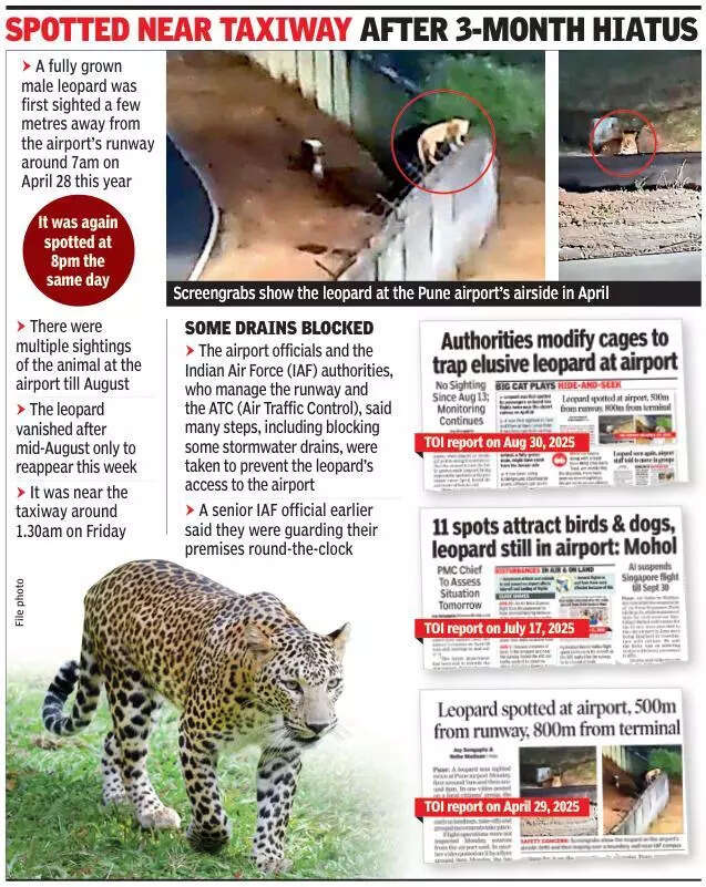 Pune: The big cat is back. It’s on the prowl again at the airport, after a three-month hiatus.Trap cameras are back in action. So will be cages… For the pricey catch.The forest department officials on Saturday confirmed that the leopard was sighted again near the airport’s taxiway this week. A source said the animal was spotted on the premises in the early hours of Saturday. It was near the taxiway around 1.30am on Friday. The animal was sighted once more in the airport earlier this week.No flight movement was affected. According to some forest officials, the same leopard was at the airport a few months ago.Chief conservator of forests, Pune circle, Ashish Thakare said, “Four trap cameras have been installed at the airport. We will install trap cages too. This leopard is taking advantage of the complex tunnel system under the Air Force station.”Minister of state for civil aviation Murlidhar Mohol told the forest department officials to work fast in coordination with the airport and the Indian Air Force (IAF) authorities to capture the leopard. He is likely to preside over a meeting with them on Sunday. “Instructions have been issued to increase the lighting near the runway and the taxiway,” a source close to the minister said.Mangesh Tate, assistant conservator of forests, told TOI that they received a message from the airport authorities a couple of days back regarding the animal sighting. “It might have entered the airport via some openings on the airside. They (airport authorities) did not share any picture of the animal,” he said.The airside is the section of an airport beyond the security checkpoints.Earlier, leopard was sighted twice at the airport on April 28 — first around 7am and then at 8pm. Thereafter, it was spotted multiple times at the facility till mid-August. The Airports Authority of India (AAI), IAF and the forest department jointly took multiple steps to capture the leopard, but in vain.Mohol had said on July 16 that the leopard was moving in and out of the airport. The forest department was told to identify and block the stormwater drains through which the animal entered the facility. The leopard was not sighted till this week after mid-August, following the measure.Tate, assistant conservator of forests, said, “Leopards are shy animals. They move in a territory. The airport area seems to be a part of this leopard’s territory. As it moves around, it passes through the airport. If the airport officials and other stakeholders take steps towards identifying and blocking its path through which it enters the airport, it won’t be able to come in.”Messages and multiple calls to the Pune airport director, Santosh Dhoke, went unanswered. A source in the airport said the AAI had circulated a message about the animal’s presence.TOI also sent queries to the IAF regarding steps they took to plug the points through which the leopard entered the airport premises. A reply was awaited till going to press.Senior ResQ team officials said some villagers in Lohegaon recently claimed that they had spotted a leopard. The forest department officials have been checking the area since then.