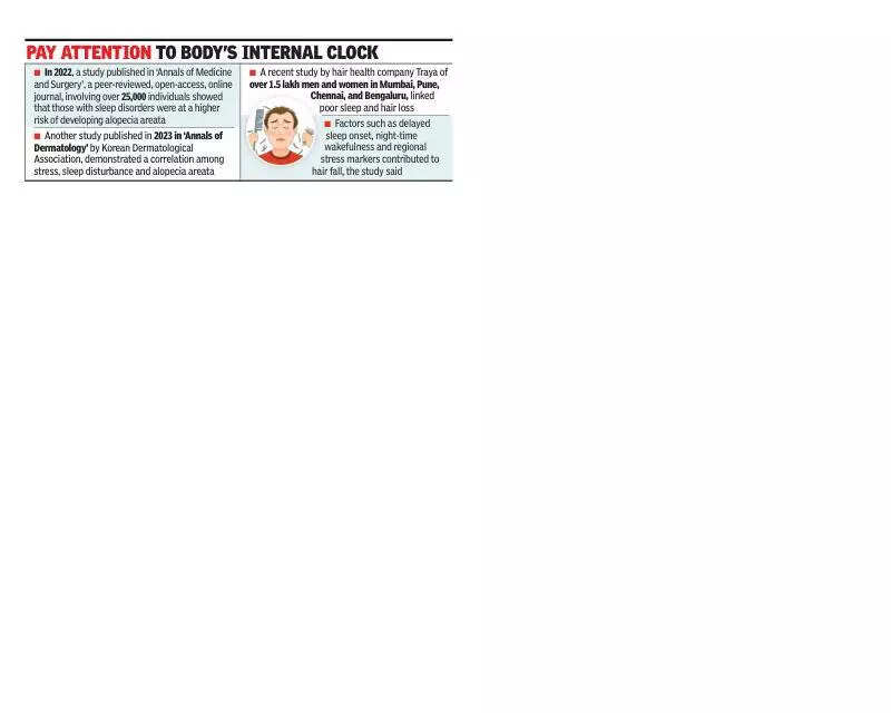 Pune: Over a few months, Raj from Mumbai noticed more hair on his pillowcase than usual. The 29-year-old approached a dermatologist who linked his problem to a poor sleep pattern.Raj said, “My sleep was hampered for months. I always thought hair loss was about stress or diet, but I never expected lack of sleep to hit this hard. I’ve lost a lot of hair. After researching and consulting a doctor, I realised that sleep is directly connected to hair health. I corrected my lifestyle and food habits and focused on my sleep pattern and that reduced my hair loss.” Doctors said that sleep deprivation leads to a rise in stress levels that impact hair. The body creates extra cortisol, a stress hormone and high cortisol levels are associated with telogen effluvium, a disorder in which hair follicles enter the resting phase prematurely, resulting in excessive shedding.Deep sleep boosts blood flow to the scalp, allowing oxygen and critical nutrients to reach follicles.Dr Sapana Kamalani, dermatology consultant at Jupiter Hospital in Pune, said sleep regulates critical hormones such as melatonin which helps manage the hair growth cycle. Hormonal imbalance resulting from sleep deprivation can result in thinning and delayed regrowth.She added that deep sleep promotes collagen formation, an important structural protein that promotes healthy hair by strengthening the hair shaft and improving overall scalp health.“Lack of sleep can cause a dry, irritated scalp and reduced hair structure, leaving hair more susceptible to breaking and thinning. Finally, sleep is necessary for immune system function. A weakened immune system makes it more difficult for the body to heal damaged cells, particularly those in the scalp and hair follicles affecting hair growth,” Dr Kamalani added.Preeti, a 37-year-old from Pune, said, “Post-partum, I have had many sleepless nights. My hair began to grow thin, appear lifeless, and fall more frequently than usual because of late nights and poor sleep. I was undergoing treatment for my hair but they were not effective. But once I corrected my sleep cycle, I could see my hair strengthening over the in the next few months.”Dr Prajna Satpathy, dermatologist at Inamdar Multispecialty Hospital said when we hit that deep sleep stage, our bodies kick into repair mode, and that includes our hair follicles. During this time growth hormones are released, helping to fuel the hair growth cycle. If we don’t get enough sleep, it can throw a wrench in this process by ramping up cortisol and lowering melatonin levels. Both can harm hair health, she added.She added, “High stress hormones can push hair into the shedding phase too soon, resulting in noticeable thinning or hair loss. Plus, a lack of quality sleep can mess with how our bodies absorb nutrients and synthesize proteins, which are essential for strong, shiny hair. Even the health of our scalp and oil production are influenced by our sleep patterns.”She said that many people tend to overlook the importance of good sleep hygiene when tackling hair loss, but it is a crucial piece of any treatment strategy.“Ideally one must sleep for 7-8 hours every night. Certain medical conditions like thyroid problems, PCOS, anaemia, or autoimmune conditions can significantly impact both sleep and hair health,” Dr Satpathy added.Saloni Anand, co-founder of haircare company Traya Health, said, “If you are not sleeping well, if your nights are restless or you are struggling to fall asleep it can directly impact hormonal balance and increase inflammation — both contributors to hair loss. Stress, city life and even geography influence sleep quality and consequently, hair health.”BOXPay Attention To Body’s Clock In 2022, a study published in ‘Annals of Medicine and Surgery’, a peer-reviewed, open-access, online journal, involving over 25,000 individuals showed that those with sleep disorders were at a higher risk of developing alopecia areataAnother study published in 2023 in ‘Annals of Dermatology’ by Korean Dermatological Association, demonstrated a correlation among stress, sleep disturbance and alopecia areataA recent study by a hair health company Traya involving over 1.5 lakh Indian men and women, showed a link between poor sleep and increased hair lossThe study identified sleep disturbances in Mumbai, Pune, Chennai, and Bengaluru, directly related to compromised scalp and follicle healthFactors such as delayed sleep onset, night-time wakefulness and regional stress markers contributed to hair fall