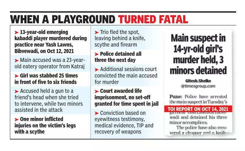 Pune: The court of additional sessions judge SR Salunkhe on Tuesday convicted and sentenced an eatery operator to life imprisonment for brutally killing a 13-year-old emerging kabaddi player near Yash Lawns in Bibvewadi on Oct 12, 2021.The incident happened in the presence of the minor’s five to six friends, while they were practising the game in an open plot.The prosecution’s case was that the main accused (aged 23 when the crime occurred) of Katraj brutally stabbed the girl 25 times such that her head was almost severed from the body. He was accompanied by two minors. The accused was the girl’s distant relative. He held a gun to her friend’s head when she tried to snatch away the sharp weapon. One of the two minor boys inflicted injuries on the victim’s legs with a scythe. Police said the girl’s family had disapproved of his relationship with her.The trio fled after the attack, leaving the knife, the scythe and the firearm on the spot — which the police recovered. The next day, police detained the trio and referred the two minors to a legal process under the Juvenile Justice Act. A chargesheet was filed against the main accused.Salunkhe held that special public prosecutor Hemant Zanjad proved the murder charge beyond reasonable doubt through consistent eyewitness testimony, medical evidence and recoveries made during the investigation. The court said “… the life imprisonment shall run from the date of this order.” The court also held that the case did not fall within the rarest of the rare ambit as defined by the Supreme Court to merit a death sentence.Salunkhe relied on the testimonies recorded by three of the five eyewitnesses as also the test identification parade (TIP) during which they identified the youth and his confession statement which was consistent with the eyewitnesses’ account.Defence lawyer Yashpal Purohit told TOI: “We will explore the legal remedy of filing an appeal before a higher court against the conviction and life sentence.”The judge noted: “There were five eye witnesses in this case. Three have been examined and they have fully supported the prosecution’s case. Under the circumstances, the question is whether it was necessary to examine the rest of them. The answer would be ‘no’. It is the quality and not the quantity that matters. Secondly, what prejudice has been caused to the accused by not examining the rest of the witnesses is nowhere explained. Why those witnesses should be disbelieved is nowhere shown.”“As regards interested witnesses, only the informant (complainant) is a relative of the deceased and also of the accused. The four girls … who were present with her are not related to the deceased and didn’t even know the accused. There is no remote possibility that they would falsely implicate him,” the court said.