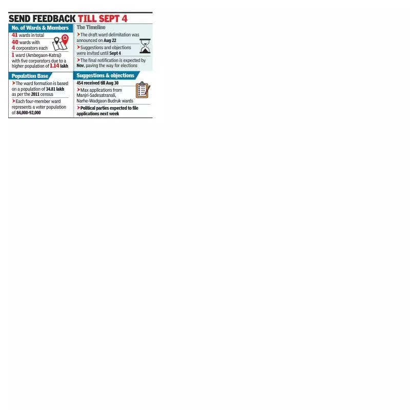 Pune: The civic administration has received the highest number of memoranda from wards in newly merged areas, within a week of opening the draft of PMC ward boundaries for public feedback and objections ahead of the upcoming civic elections. Not a single objection or suggestion has been received in 11 wards so far.“Of 454 suggestions and objections received so far, 325 are from the merged areas,” an official said. Sept 4 is the last date to submit suggestions and objections. Sources from political circles said the parties would raise objections next week. The city unit head of NCP (SP), Prashant Jagtap, said a committee was formed to receive objections from their workers, which would submit the applications next week. Politicians from Congress said meetings were held recently to discuss the draft of ward boundaries and party workers would submit the objection letters to the election commission and civic administration soon.Among the objections received so far, the maximum are from the newly carved Manjri Budruk-Sadesatranali ward limits. “As many as 164 objections have been received. Objections have been raised about the abrupt division of the ward and the inclusion of some areas from Kharadi in this ward,” a source said.The Narhe-Wadgaon Budruk is another ward that covers merged areas and has recorded 153 objections so far. “Objections have been raised pertaining to the failure in following natural boundaries while deciding the ward map,” a local political activist said.A politician from NCP said many political workers were busy with Ganeshotsav activities, and the objections were expected to be raised by these workers soon. “About 20 objections have been raised pertaining to the Pune Station-Jayjawannagar ward. Some areas of Yerawada have been included in this ward, which has surprised local leaders and former corporators from the area,” the source said.The civic administration had last week released maps of 41 wards for the upcoming civic polls. As many as 165 corporators will be elected from these wards. Forty wards will have four corporators each, while one ward will have five corporators.GRAPHICNumber of Wards & Members41 wards in total40 wards with 4 corporators each1 ward (Ambegaon-Katraj) with five corporators due to a higher population of 1.14 lakhPopulation BaseThe ward formation is based on a population of 34.81 lakh as per the 2011 censusEach four-member ward represents a voter population of 84,000-92,000The TimelineThe draft ward delimitation was announced on Aug 22Suggestions and objections were invited until Sept 4The final notification is expected by Nov, paving the way for electionsSuggestions & objections 454 received till Aug 30Max applications from Manjri-Sadesatranali, Narhe-Wadgaon Budruk wardsPolitical parties expected to file applications next week