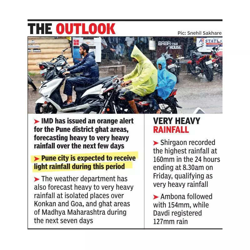 Pune: Monsoon activity picked up marginally across the district on Friday, as heavy to very heavy rainfall was recorded in several ghat areas, including Shirgaon, Ambona, Davdi, Dongerwadi, Lonavla, Mulshi, Walwhan and Tamhini. Shirgaon recorded the highest rainfall at 160mm in the 24 hours ending at 8.30am on Friday, qualifying as very heavy rainfall. Ambona followed with 154mm, while Davdi registered 127mm rain. According to the India Meteorological Department (IMD), moderate rainfall is classified as 15.6mm to 64.4mm in a 24-hour period, while heavy rainfall ranges from 64.5mm to 115.5mm. Rainfall exceeding 115.5mm is classified as very heavy and anything over 204.4mm is considered extremely heavy.Several locations in the state, including Lonavla (101mm), Dongerwadi (99mm), Bhira (79mm), Walwhan (77mm) and Tamhini (75mm), recorded heavy rainfall. Mulshi (Camp) and Mulshi (Bung) recorded 73mm and 68mm rain, respectively. Other notable rainfall figures included 54mm in Khopoli, 45mm in Kundle, 42mm in Bhivpuri, 39mm in Khand and 37mm in Nilshi. The precipitation in all these places was in the moderate rainfall category.The rainfall distribution highlighted the typical monsoon pattern with Western Ghats receiving the heaviest showers. Locations like Dudulgaon received 9mm and Lavale 6.5mm rain during the 24 hours ending at 8.30am on Friday. Central Pune areas recorded minimal precipitation. Pashan and Narayangoan each received just 1mm, while Dapodi recorded 0.5mm rain. The city’s main weather station in Shivajinagar logged a mere 0.4mm showers and Baramati received only 0.2mm.Moderate rainfall activity continued into Friday afternoon, with data from 8.30am to 5.30 pm showing Girivan leading with 35mm, closely followed by Kurvande at 34.5mm and Bhor at 28mm. The pattern remained consistent with ghat areas receiving higher precipitation compared to the urban core, where Shivajinagar recorded just 1.1mm during the nine-hour period.The IMD has issued an orange alert for the Pune district ghat areas, forecasting heavy to very heavy rainfall over the next few days. Pune city is expected to receive light rainfall during this period. The weather department has also forecast heavy to very heavy rainfall at isolated places over Konkan and Goa, and ghat areas of Madhya Maharashtra during the next seven days, while light to moderate rainfall is likely over most parts of the region.Across Maharashtra, Friday witnessed scattered rainfall activity after 8.30am. In Madhya Maharashtra, Mahabaleshwar in Satara district recorded 30mm rain. Matheran in Raigad district received 30mm showers in the Konkan region , while Mumbai’s Colaba recorded 20mm. Yeotmal in Yavatmal district of Vidarbha received 20mm of rainfall.(FOR GRAPHIC)HL: THE OUTLOOKIMD has issued an orange alert for the Pune district ghat areas, forecasting heavy to very heavy rainfall over the next few daysPune city is expected to receive light rainfall during this periodThe weather department has also forecast heavy to very heavy rainfall at isolated places over Konkan and Goa, and ghat areas of Madhya Maharashtra during the next seven daysVERY HEAVY RAINFALLShirgaon recorded the highest rainfall at 160mm in the 24 hours ending at 8.30am on Friday, qualifying as very heavy rainfallAmbona followed with 154mm, while Davdi registered 127mm rain