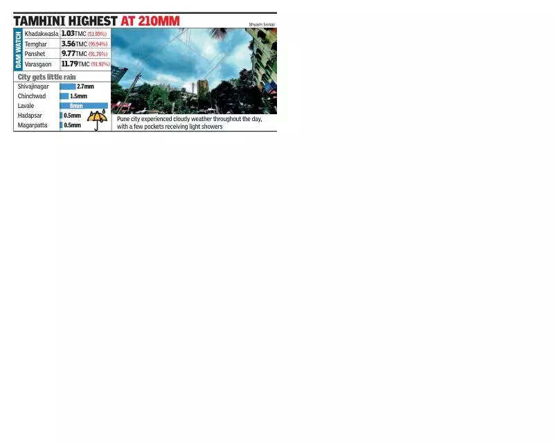 Pune: The Met department has sounded a red alert for ghat areas on Monday and Tuesday as rains lashed several pockets between 8.30pm on Saturday and 8.30am on Sunday.Tamhini received the highest rainfall at 210mm, followed by Koyna (Navja) with 174mm and Koyna (Pophali) with 151mm.An official from India Meteorological Department (IMD) said a number of systems are present in the country, leading to rainfall in different parts of the state.“These systems include the monsoon trough running south of its normal position. Under the influence of the upper air cyclonic circulation over west-central and adjoining northwest Bay of Bengal, off north Andhra Pradesh and south Odisha, a fresh low-pressure area has formed over the same region. A trough runs from northeast Arabian Sea to upper air cyclonic circulation associated with the low-pressure area over west-central and adjoining northwest Bay of Bengal, off north Andhra Pradesh and south Odisha coasts across north Marathawada, cyclonic circulation associated with Vidarbha and neighbourhood, and south Chhattisgarh, between lower and middle tropospheric levels tilting southwards with height,” the official said.Meanwhile, the city and its surrounding areas experienced varied rainfall as some pockets received moderate ot light showers.Lavale had the highest rainfall at 8mm, followed by Nimgiri with 5.5mm and Pashan with 4mm. Shivajinagar received 2.7mm of rainfall, while 0.5mm of rain was recorded in Hadapsar and Magarpatta. Talegaon received 2mm of rain, while Chinchwad had 1.5mm. Areas such as Lonavla, Thakurwadi, Walvan, Wangaon, and Shirota recorded between 30mm and 54mm of rainfall.Across the region, other notable rainfall figures include Bhira with 123mm, Shirgaon with 120mm, and Ambone with 115mm. Bhivpuri and Dawdi also saw substantial rainfall, recording 98mm and 110mm, respectively.Along with Pune, a red alert has also been issued for ghat sections of Satara, Raigad, Ratnagiri, and Kolhapur on Monday, while for Tuesday, districts including Satara and Palghar also have red alerts.Alert for low-lying areasThe irrigation department has issuedalerts for low-lying areas of Pune, as the Temghar dam is filled to its 95% capacity. Water discharge from the dam is expected after reaching its total capacity.The catchment areas of dams that provide water to Pune witnessed light rainfall. Khadakwasla recorded 2mm, Temghar received 27mm, Varasgaon (24mm), and Panshet (26 mm) rainfall till 8am on Sunday.The four dams in the Khadakwasla circle have around 26.14 TMC of water, 89% compared to their total capacity. These dams had around 28.39 TMC of water, around 97%, on the corresponding day last year.Dam WatchPercent TMC Khadakwasla 51.99% 1.03 TMC Temghar 95.94% 3.56 TMC Panshet 91.76% 9.77 TMC Varasgaon 91.92% 11.79 TMC MSID:: 123346431 413 |