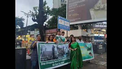 Navi Mumbai: Upset by the illegal pruning of an almond tree on multiple occasions in the past two years to enhance the display of a hoarding, many nature lovers and activists staged a silent protest in front of the damaged tree at Vashi, Sector 1, near Ganesh Tower.“This almond tree was first cut from the top in January 2023. We later noticed that a new hoarding was installed near this tree a month later, in February 2023. Since then, it was chopped and illegally pruned several times to improve the hoarding display,” said B N Kumar of NatConnect Foundation NGO.“The latest illegal cutting of this tree happened during the recent Ganeshotsav festival when it was partially covered by plastic banners. It has badly damaged this beautiful tree. It is time we ask ourselves whether we want trees or hoardings in our city,” said activist Madhu Shankar.Many children also participated in this green protest, as they too have regularly witnessed the slow cutting and pruning while passing by along the busy Vashi-Koparkhairane main road.“Since the hoarding faces the main road, the advertising company does not want any obstacle for its display screen. However, it is unethical,” said RTI activist Anarjit Chauhan.Chauhan added: “As per Maharashtra outdoor advertisement policy rules of 2022, it is mandatory under rule 20 (e) to deposit Rs 2500 per tree, but there is no communication between the tree authority and licence department, which issues the consents for the same, causing a revenue loss to the corporation. And now these vendors have started a new policy of killing trees near the hoarding, which is undoubtedly harming the fundamental rights of trees too.“The Vashi ward of Navi Mumbai Municipal Corporation (NMMC) has in the past issued notices to Shree Advertising Company whenever citizens complained to the civic body about the illegal tree cutting for the hoardings. However, no concrete action was taken against the offenders, as they have denied harming the tree.“Will anyone easily say that they cut the tree? The NMMC has to simply gather circumstantial evidence and perhaps CCTV footage in order to stop further tree destruction. Many more trees were similarly cut to make space for newer hoardings, which is a sad situation for our city,” added Kumar.