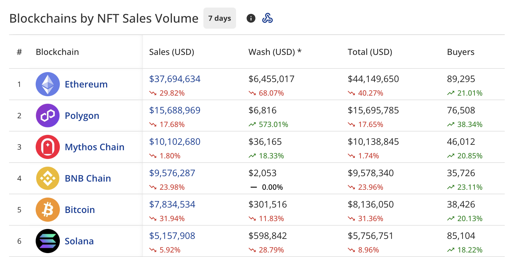 Ethereum has maintained its leading position with $37.7 million in sales, falling 29.88% from the previous week. Ethereum’s wash trading has plummeted by 68.03% to $6.4 million.