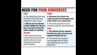 Pune: A nine-year-old boy from the city suffered a severe eye injury from a cricket ball, which almost cost him his vision. Fearing his parents’ reaction, he delayed telling them about the injury for two months, by which time his vision had deteriorated significantly due to retinal scarring. Fortunately, after undergoing four surgeries over two years, the vision was eventually restored.Ophthalmologist Dr Harsh Jain with the National Institute of Ophthalmology said, “Due to the delay in informing his parents, the injury became severe leading to scarring and blindness in the right eye. Upon realising the severity of the condition, he was finally brought to our hospital in March 2023. We diagnosed his injury as Traumatic Subluxated Cataract with retinal detachment and proliferative retinopathy, which is basically scarring on the retina due to the injury.“A Traumatic Subluxated Cataract is a type of eye injury that occurs when the lens inside the eye becomes partially dislocated (subluxated) due to trauma, often resulting in cataract formation.Dr Jain, who assisted during the surgery, said, “The scarring had to be removed to fix the retina back in place, which was the most complex part of the surgery. Firstly, the removal of the scarred tissue in children is difficult, and secondly, there is always a tendency that it can come back again, which can cause a recurrence in detachment.”When the doctors operated on the patient for the first time in April 2023 he developed a recurrence due to the scarring that is more common in children than adults since their body’s repair mechanism is stronger. Dr Mounika Bolisety, retina consultant, also part of the surgical team, said, “To get rid of the scarring, we took up a series of surgeries, including one in Sept 2023, then another in Feb 2024 and the final one in July 2024, to put the lens in place behind the iris and subsequently remove the silicone oil, which was used to fix the retina back in place for the final surgery. After these surgeries, regular follow-ups were conducted for more than six months. During his last follow up in July this year, the patient regained vision of 15-20 feet.”On the need for four surgeries, Dr Aditya Kelkar, director at NIO Super Specialty Hospital who performed the surgery, said, “In the first surgery, the cataract was removed and the retina was reattached with the help of a laser. Then silicone oil was added and a laser was used (which works like welding). During the second surgery, the recurrent scar tissue on the retina was removed and the oil was reinjected. In the third operation, the same procedure was done, and in addition, some bad parts of the retina were removed (also known as retinectomy). Then the recurrent scar tissue was removed. Lastly, in the fourth surgery, the silicone oil was removed, and a new lens was fixed behind the iris as the natural lens support was damaged due to injury.”Dr Kelkar said, “Most children and even adults would either hide or brush off injuries caused to the eye during a sport as frivolous. Such delay in identifying serious trauma can lead to further complications. The scarring in this patient’s eye was severe enough that four separate surgeries had to be performed. The child still has a long way to go to recover his vision to a good extent.”