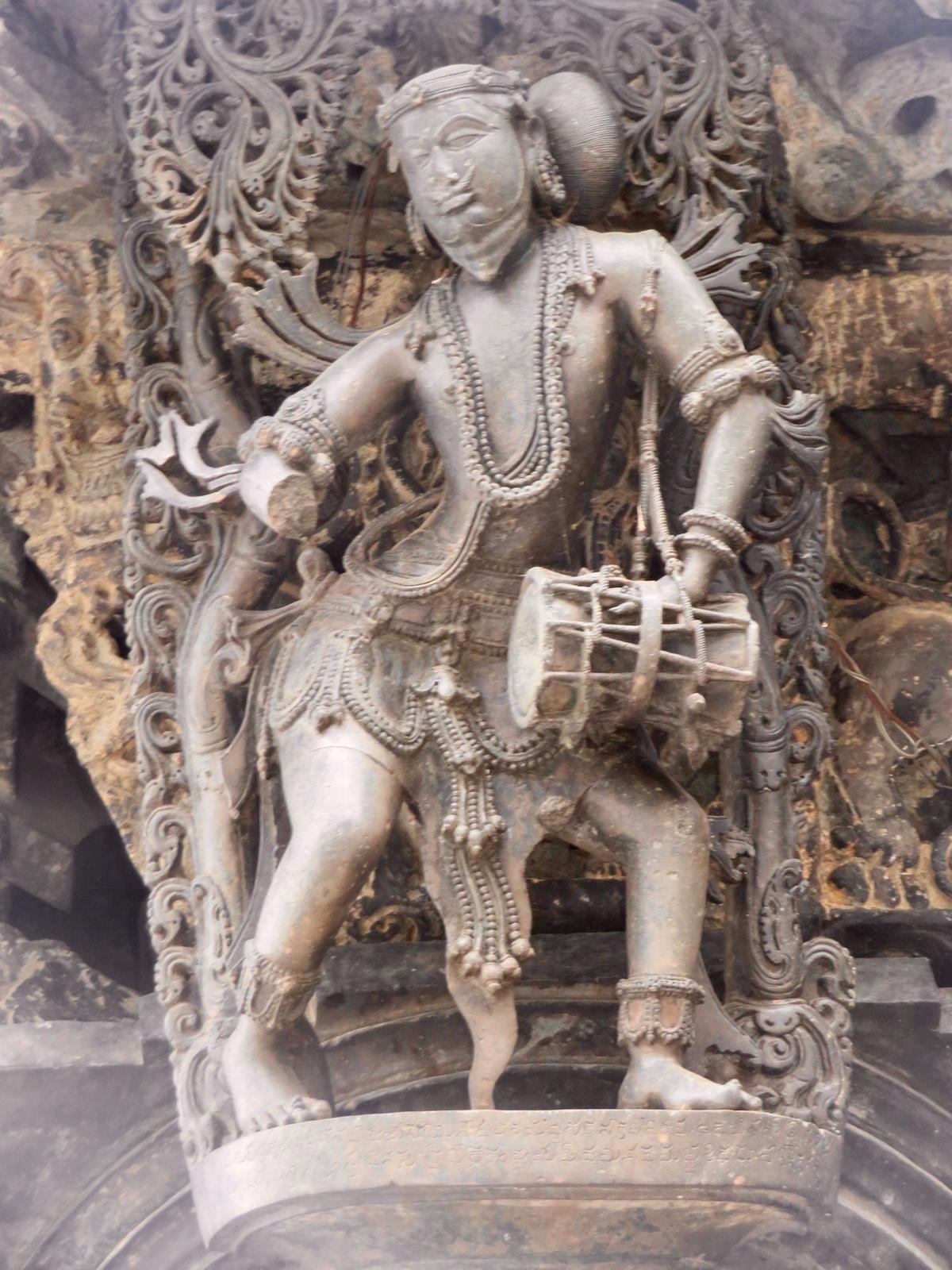 A sculpture of a musician with a drum at the Chennakeshava Temple in Belur.
