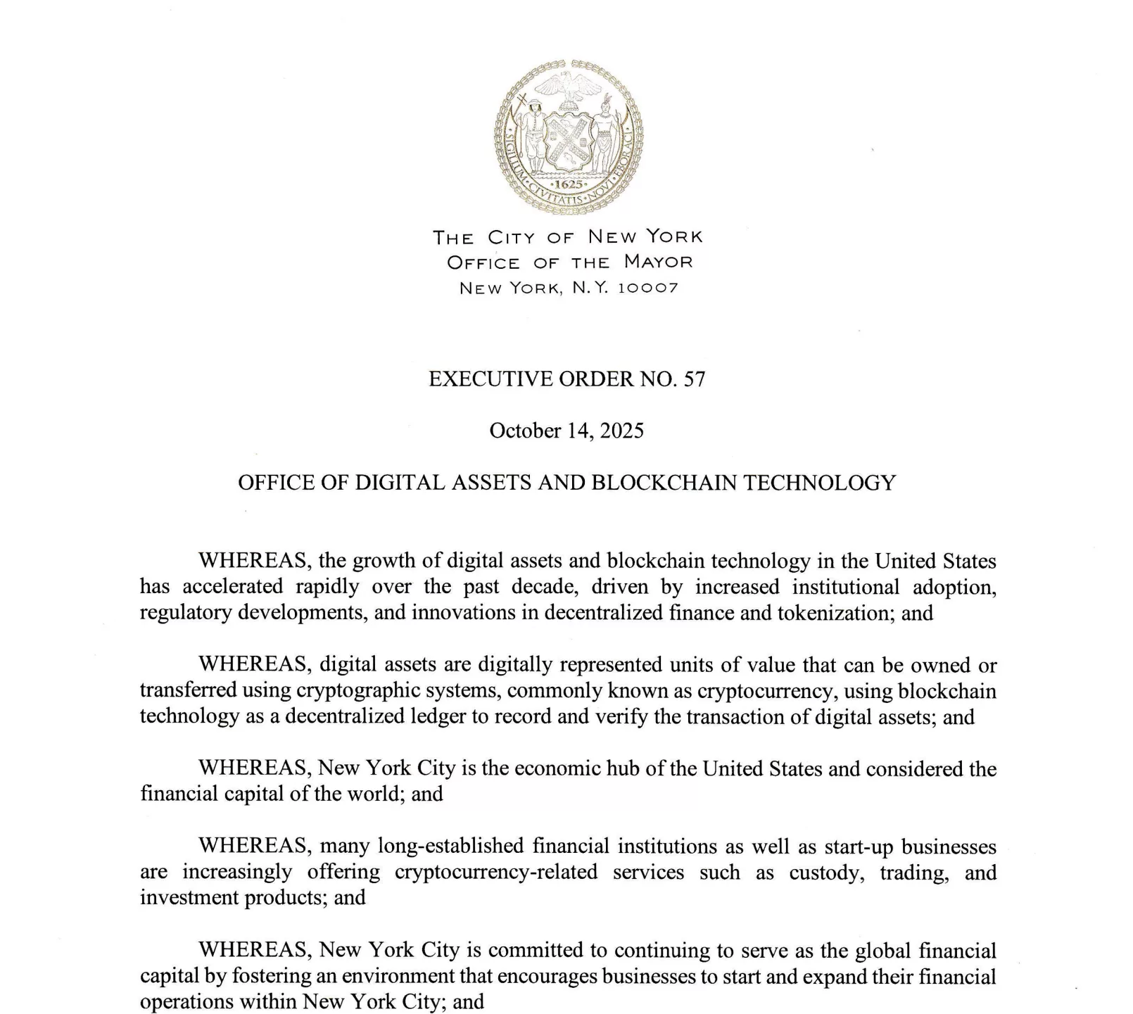 Mayor Eric Adams signed the executive order on Oct. 14, establishing the NYC Office of Digital Assets and Blockchain, designed to coordinate city agencies and private industry in promoting the responsible use of blockchain and digital currencies.