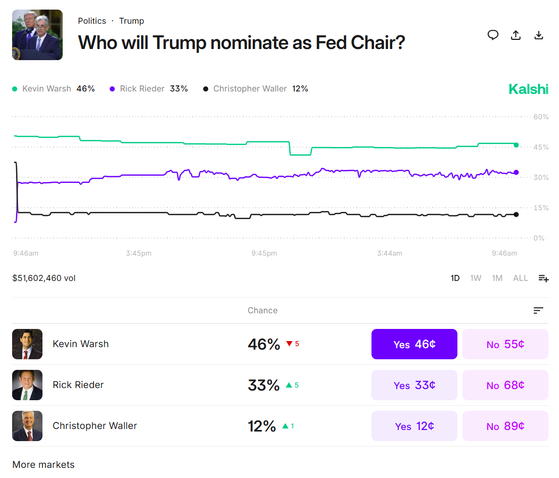 While he still trails White House economist Kevin Warsh overall, the gap narrowed over the past 24 hours as Warsh’s odds dropped 7% on Polymarket and 5% on Kalshi.
