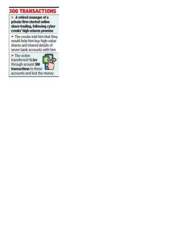 Pune:A 75-year-old Kharadi-based retired manager of a private company lost Rs1.5 crore between July and Oct last year after cybercrooks promised him handsome returns in online share-trading.He submitted a complaint to the Pune cybercrime police in Jan. After its verification, an FIR was registered on Wednesday.