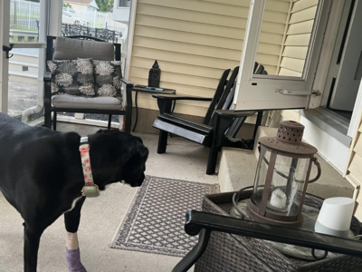 At first glance, the photo resembles a simple, welcoming patio scene with a cute dog placed on an ornate rug, surrounded by patio furniture. All seems cozy and calm. But if you take a closer look, you’ll see something unique: there is a hidden cat in the photo!This brain teaser looks easy at first glance, but trust us, it’s actually really challenging. The actual challenge is the catch: only those with a high IQ and perfect 20/20 vision are able to complete it in a mere 12 seconds. Think you’ve got what it takes? Try it and see if you can find the hidden cat before the time elapses!The picture illustrates a patio space with outdoor furniture, such as chairs and a little table. There is a black dog wearing a purple bandage on one of its front legs. In the background, you can see a yard filled with trees and a fence. There is a lovely lantern on the table. The whole scene looks peaceful and warm. But here is a surprise: in this warm atmosphere there also exists an unseen cat. Believe you can do it. Good luck.