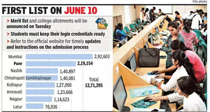 Pune: Over 12 lakh students from across the state registered for the first-year junior college (FYJC, Std XI) admissions for this year. The registration portal closed on Thursday afternoon. Students who have completed and locked Part I and II of their application forms will be able to see their seat allocations in colleges on June 10 after the first merit list is announced by the Centralised Admissions Process (CAP) committee. According to official figures, 12,71,295 students registered on the portal.Education officer (secondary) Shriram Panzade said, “The entire online admission process was conducted smoothly. We saw active engagement from students, parents and schools.” Mumbai division had more than 2.9 lakh registrations, the maximum, while the Pune division had approximately 2.2 lakh applications. Other divisions like Nagpur, Nashik, Kolhapur, and Chhatrapati Sambhajinagar also saw robust participation.As per the admission schedule released by the CAP committee, display of provisional merit list for students to verify their details will be on Thursday, and Saturday will be the deadline for raising objections and correcting application details. First Round On June 10 Merit list and college allotments will be announced on Tuesday Students must keep their login credentials ready Refer to the official website for timely updates and instructions on the admission processMumbai I 2,92,603Pune I 2,19,154 Nashik I 1,40,897Chhatrapati Sambhajinagar I 1,40,081Kolhapur I 1,27,090Amravati I 1,23,666Nagpur I 1,14,623Latur I 76,936Total I 12,71,295 Pune: Over 12 lakh students from across the state registered for the first-year junior college (FYJC, Std XI) admissions for this year. The registration portal closed on Thursday afternoon. Students who have completed and locked Part I and II of their application forms will be able to see their seat allocations in colleges on June 10 after the first merit list is announced by the Centralised Admissions Process (CAP) committee. According to official figures, 12,71,295 students registered on the portal.Education officer (secondary) Shriram Panzade said, “The entire online admission process was conducted smoothly. We saw active engagement from students, parents and schools.” Mumbai division had more than 2.9 lakh registrations, the maximum, while the Pune division had approximately 2.2 lakh applications. Other divisions like Nagpur, Nashik, Kolhapur, and Chhatrapati Sambhajinagar also saw robust participation.As per the admission schedule released by the CAP committee, display of provisional merit list for students to verify their details will be on Thursday, and Saturday will be the deadline for raising objections and correcting application details. First Round On June 10 Merit list and college allotments will be announced on Tuesday Students must keep their login credentials ready Refer to the official website for timely updates and instructions on the admission processMumbai I 2,92,603Pune I 2,19,154 Nashik I 1,40,897Chhatrapati Sambhajinagar I 1,40,081Kolhapur I 1,27,090Amravati I 1,23,666Nagpur I 1,14,623Latur I 76,936Total I 12,71,295