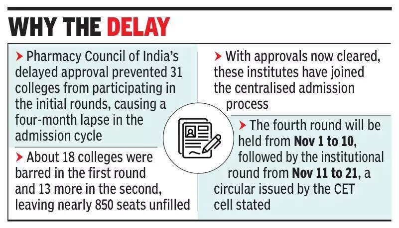 Pune: As many as 6,121 students were allotted seats after 2,000 additional seats were added across 38 newly approved colleges in the third round of Bachelor in Pharmacy admissions. The total number of seats has now increased to 56,000 across 447 colleges. Students must confirm their admissions by Thursday. Earlier, 24,186 students secured seats in the first two rounds. Around 14,000 seats remain vacant and will be filled in the next two rounds. Officials expect the vacancy to reduce substantially once the newly recognised colleges start enrolling students. “The addition of 38 colleges has expanded access and opened new opportunities for students, particularly in rural districts where options were earlier limited,” a senior CET cell official said.Experts said the approval delays disrupted the academic calendar. “This year’s prolonged admission schedule has put academic planning under stress. But the fresh round offers a fair chance for students who were left out earlier,” Sandeep Patil, principal of a Nashik-based pharmacy college, said.The CET Cell has instructed colleges to complete document verification and admission confirmation strictly as per schedule to avoid delays. “This round is crucial for students as many newly added colleges offer fresh options, especially in regions where seats were previously unavailable,” an official involved in the admission process said.Why The Delay Pharmacy Council of India’s delayed approval prevented 31 colleges from participating in the initial rounds, causing a four-month lapse in the admission cycleAbout 18 colleges were barred in the first round and 13 more in the second, leaving nearly 850 seats unfilledWith approvals now cleared, these institutes have joined the centralised admission processThe fourth round will be held from Nov 1 to 10, followed by the institutional round from Nov 11 to 21, a circular issued by the CET cell stated