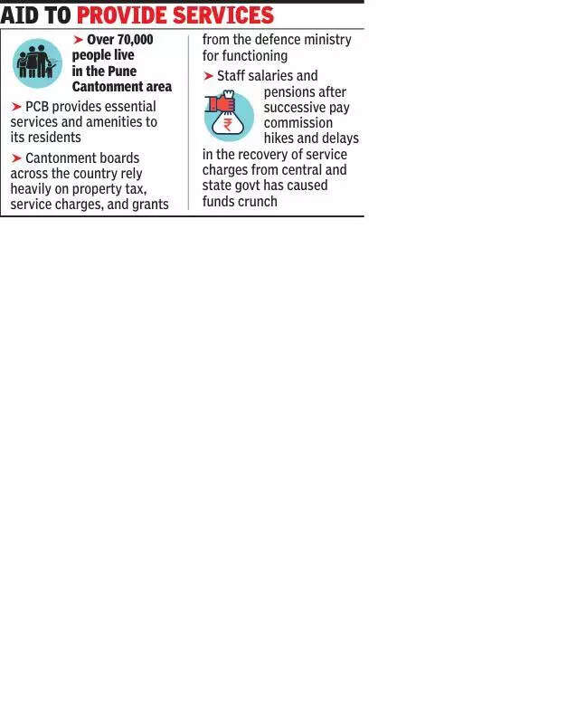 Pune: The Pune Cantonment Board (PCB) has sent a proposal to the ministry of defence (MoD) seeking financial assistance of Rs 95 crore to tide over its mounting liabilities.The board, responsible for providing essential services to over 70,000 residents in the Cantonment area, grappled with unpaid water charges, electricity bills, and arrears of the pay commission, which are currently being cleared in instalments.PCB officials acknowledged that the board’s financial position has deteriorated sharply in recent years, with routine services such as water supply, sanitation, and timely salary payments facing stress.“We require funds urgently to clear pending dues and maintain essential civic amenities. Without timely intervention, the situation could worsen for residents as well as employees,” a senior PCB official told TOI.The PCB, like other Cantonment boards in India, relies heavily on property tax, service charges, and grants from the defence ministry.The revenue, however, has remained stagnant even as expenditure, particularly on staff salaries and pensions after successive pay commission hikes, surged. In addition, recovery of service charges from central and state govt offices within Cantonment limits has often been delayed, adding to the cash crunch.“We received Rs 4 crore service charges recently from the Army authorities, but the pending amount is in some hundred crores for the last few years,” the official said.“With rising demand for civic services, boards are under pressure to deliver more with limited resources. The MoD has, on occasion, provided additional support, but with multiple boards raising demands simultaneously, meeting all requirements has become challenging,” he said.Local representatives in Pune have urged the defence ministry to prioritise the PCB’s request, citing the large civilian population dependent on the board.“This is not just a matter of clearing bills; it is about safeguarding essential services for lakhs of residents,” said Priyanka Shirigiri, former member of the PCB.PCB officials are hoping for an early release of funds that would provide much-needed relief to its administration and the people it serves.