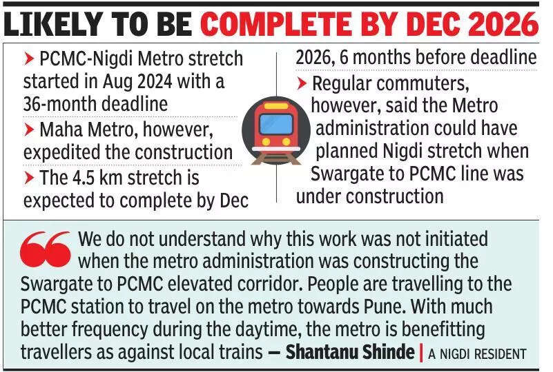 Pune: The civil work of the Nigdi elevated Metro line in the PCMC limits has reached its halfway mark.Started in Aug 2024, Maha Metro has said that the remaining 50% of the work is expected to be completed in the next 14 months by Dec 2026.The 4.5 km Metro stretch is a natural extension to the Swargate to PCMC route, with four stations at Chinchwad, Akurdi, Nigdi and Bhakti-Shakti Chowk. A period of three years (36 months) had been set for the completion; however, Maha Metro is targeting finishing it within 30 months. Officials said with no major hurdles in sight pertaining to land availability, the work will be completed early.The viaduct of the project is aligned on the old Pune-Mumbai highway. Metro officials said initially, work started in the Pimpri to Chinchwad section, but it has been extended along the entire stretch. More than 50% of the pillars are ready, they said, adding that the installation of segments has been taken up between Pimpri and Chinchwad.Regular commuters are eagerly waiting for the commencement of services on the Nigdi stretch. The commuters said the work should have been taken up in the first phase itself. Shantanu Shinde, a resident of Nigdi, said the Nigdi extension will provide a direct connection between Pune and Pimpri Chinchwad. “We do not understand why this work was not initiated when the metro administration was constructing the Swargate to PCMC elevated corridor. People are travelling to the PCMC station to travel on the metro towards Pune. With much better frequency during the daytime, the metro is benefitting travellers as against local trains,” Shinde said.Officials from the Maha Metro said talks with PCMC are underway to provide spaces for the construction of stations and their entry-exit points. Traffic diversions have been introduced at some locations to assist the works.Maha Metro begins repairs of service roadMaha Metro has started filling potholes and repairing service roads along the metro work in the Chinchwad area. Commuters on the stretch were unhappy over the poor condition of the road and had approached PCMC for urgent repairs. MSID:: 124455112 413 |GFX:LIKELY TO BE COMPLETE BY DEC 2026PCMC-Nigdi Metro stretch started in Aug 2024 with a 36-month deadlineMaha Metro, however, expedited the constructionThe 4.5 km stretch is expected to complete by Dec 2026, 6 months before deadlineRegular commuters, however, said the Metro administration could have planned Nigdi stretch when Swargate to PCMC line was under constructionQUOTEWe do not understand why this work was not initiated when the metro administration was constructing the Swargate to PCMC elevated corridor. People are travelling to the PCMC station to travel on the metro towards Pune. With much better frequency during the daytime, the metro is benefitting travellers as against local trainsShantanu Shinde | a Nigdi resident