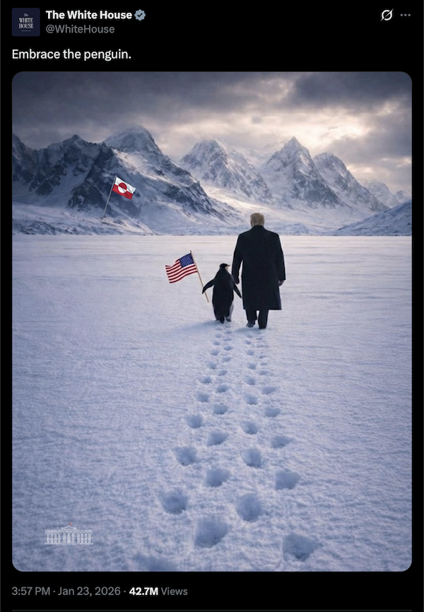 On Friday, the White House published a social media post on X of US President Donald Trump and a penguin holding hands and walking through the snow, which went viral.