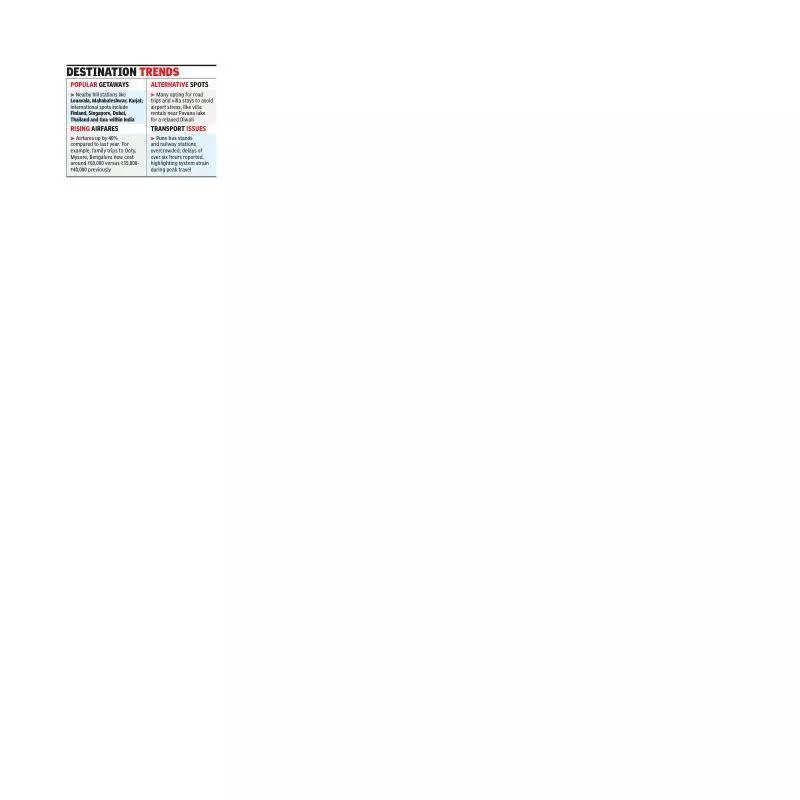 Pune: Many city residents are hitting the road or taking to the skies for a much-needed break as schools and offices shut for the Diwali holidays. While some are heading to nearby hill stations like Lonavala, Mahabaleshwar and Karjat, others are travelling farther afield to destinations as distant as Finland and Singapore.Travel agents said the festive travel surge has remained strong over the last few years, with families increasingly blending tradition with vacation.Owner of Shree Vinayak Holidays Santosh Gupta said that while the traditional focus is on pujas and home celebrations, many prefer to spend a few festive days away now. “We have done over 15 bookings for Dubai and Singapore this season. Even though the direct flight from Pune to Singapore was discontinued, people are travelling via Mumbai. Thailand is also popular and Goa continues to draw the most bookings within India,” he said.Even with airfares up nearly 40% compared to last year, travel demand has remained resilient.Owner of Devam Tours and Travel and president of the Travel Agents Association of Pune Nilesh Bhansali said a family of four planning a trip to Ooty, Mysore and Bengaluru would have paid around Rs35,000 to Rs40,000 earlier, but are spending nearly Rs60,000 this year. “Even then, people are travelling. We’ve seen a good demand for south India and the north-east, while international travellers are opting for Finland, Manila, Singapore, Thailand, Turkey and Azerbaijan. They’re choosing countries where the visa process is simpler.”Regional airline FLY91 added flights between Oct 17 and 21 to meet the festive rush on key routes such as Goa–Bengaluru, Sindhudurg–Hyderabad and Goa–Pune. Despite this, fares remain high. One-way tickets from Pune to Kolkata between Oct 18 and 20 ranged from Rs10,000 to Rs16,000, with similar prices to Delhi and Varanasi.Road trips and short villa stays have become a popular alternative for those avoiding the stress of airports.Kalyaninagar resident Akshay Patil said, “My friends and I have rented a villa near Pavana Lake. We wanted a relaxed celebration with diyas, good food and music. Diwali in the city can get hectic, so this is our way of slowing down.”Nearby getaways continue to hold nostalgic appeal for families. Sneha Awale, who is travelling to Kolad, said, “We visited Kolad a couple of years ago before my child was born. Over the last few years, it was difficult to go anywhere, but now my son is five. We’re travelling with friends who also have kids. Everyone has company — kids can play and the adults can relax.”In Karjat, college student Rutuja More and her friends booked an Airbnb farmhouse for a casual getaway. “We chipped in and booked a place with a small pool and barbecue area. It is more of a reunion than a getaway, but being away from the city will help us enjoy the festival,” she said.Even as many have left town, Pune remains crowded. Bus stands and railway stations were packed through the week, often overwhelmed by the volume.Kondhwa resident travelling to Sambhajinagar Tanvi Shaikh said she waited nearly three hours at Shivajinagar bus stand. “Some people were waiting from 6am for their bus which took off in the afternoon. Many buses were delayed until noon or later, running more than six hours late. The crowd was overwhelming and the system was not equipped to handle it,” said Shaikh, who was travelling with her toddler.Whether escaping to cooler climes, reuniting with friends or braving delays to visit family, Diwali travel this year has been marked by high demand, high prices — and the enduring desire to celebrate, wherever the journey may lead.(Inputs from Neha Madaan)