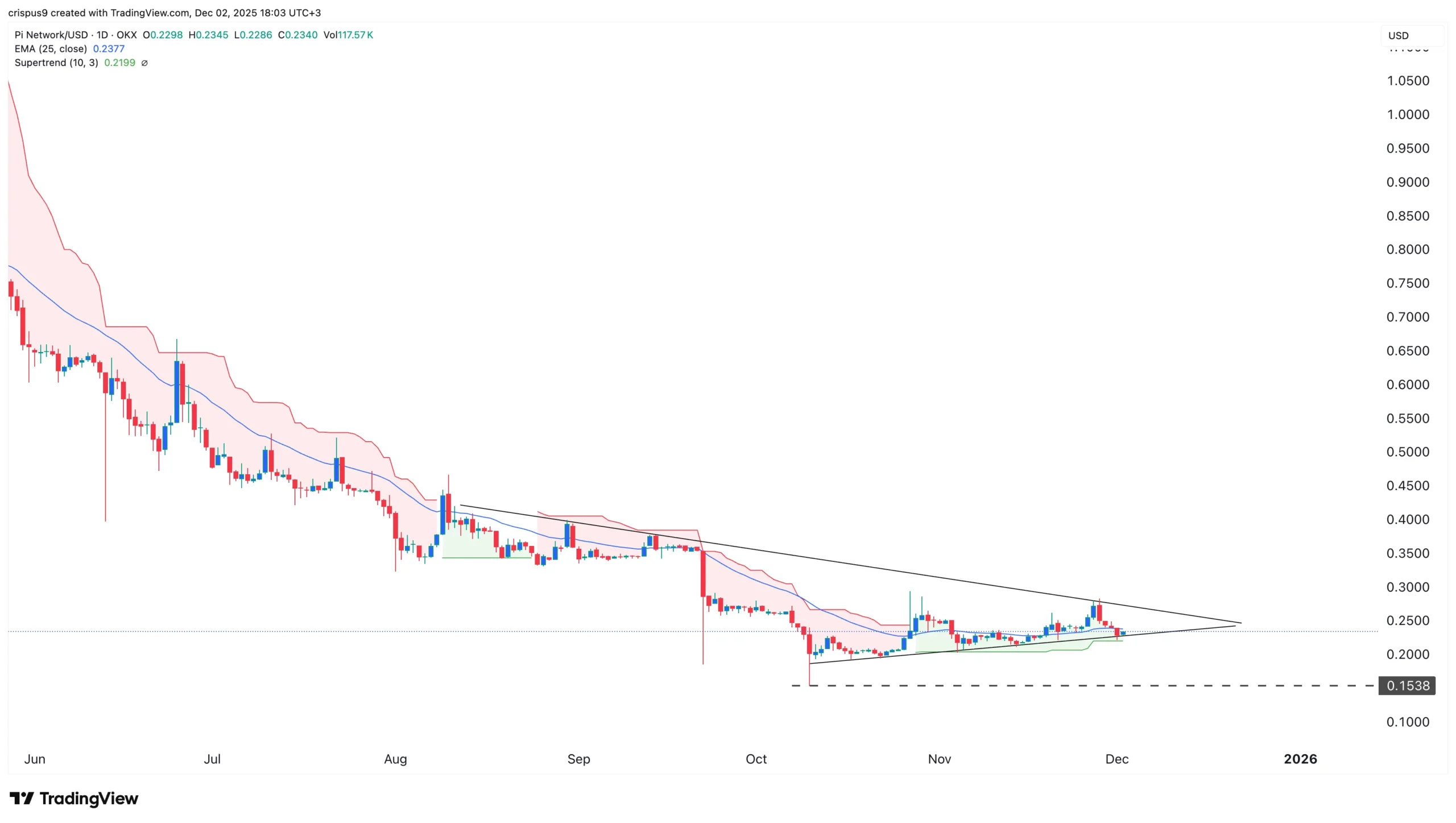 Pi Coin (PI) traded at $0.2320 today, Dec. 2, its lowest level since Nov. 21. This price is ~51% above its lowest level this year, giving it a market cap of nearly $2 billion.