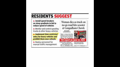 Pune: The civic administration will introduce temporary safety measures at Gangadham Chowk, including rumble strips, speed breakers and lane markings, following a June 11 accident that claimed the life of a 29-year-old woman and injured her father-in-law (61) when a truck collided with their scooter at the junction. Civic officials, however, said long-term solutions like reducing the steep gradient’s height and building a flyover remain pending approval, progressing slowly.Residents have long expressed concerns about chaotic traffic at Gangadham Chowk and the delay in implementing long-term solutions. Recently, the city traffic police banned heavy vehicles on certain stretches at the junction following a meeting with PMC officials.Akshay Nahar, a resident, said ban on heavy vehicles alone would not resolve the issue. “The civic administration and police are not making enough efforts to resolve traffic issues in the area. Political parties hold agitations after road accidents, but solutions are not in sight,” Nahar said.Gangadham Chowk is a busy intersection that receives traffic from Market Yard, Kondhwa and Bibvewadi, with hundreds of vehicles, including school buses and vans, passing through daily. Commuters said safety measures were inadequate at this key junction on major arterial roads.Santosh Nangre, a leader from the Market Yard area, said the administration has proposed a flyover and an alternate road, but the progress has been slow. “The area around Gangadham Chowk has been reporting fatal accidents. Many new buildings and commercial complexes are coming up in the area, but the road infrastructure has not been improved,” he said.The civic officials said short-term measures would be executed over the next couple of weeks, while long-term plans stuck at various levels were being pushed ahead. Activists alleged that the administration was delaying the implementation of measures. PMC is in the process of appointing an agency to take up the work of reducing the steep slope to prevent speeding or drivers losing control of vehicles. Some encroachments along the road are also expected to be removed soon, the civic officials said.A day after the fatal accident, Pune police commissioner Amitesh Kumar announced a ban on heavy vehicles between 6am and 11pm on a temporary basis in the accident-prone area, while reviewing the traffic situation at the chowk.Last year too, a woman (59) was killed and her daughter-in-law (37) was critically injured after a dumper truck had hit their scooter near Gangadham Chowk. RESIDENTS SUGGESTInstall speed breakers on steep gradients to reduce speed of vehiclesMonitor and control speeding trucks and heavy vehiclesImplement time-restricted entry for heavy vehicles and prohibit them near schoolsDeploy personnel for manual traffic management at the junctionPrioritise and expedite long-term solutions, which PMC has yet to implement