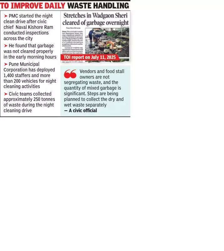 Pune: Almost a month after initiating steps to clear garbage from market areas during night hours, the civic administration has expanded the initiative to more pockets of the city to improve the handling of daily waste.Currently, civic teams collect approximately 250 tonnes of waste at night.Pune Municipal Corporation (PMC) has deployed 1,400 staffers and more than 200 vehicles for night cleaning activities.Clearing of waste during night hours started on a large scale after civic chief Naval Kishore Ram last month held inspection drives across the city, where he found that garbage was not cleared properly in the early morning hours.Sandip Kadam, head of PMC’s solid waste management department, said, “We started lifting garbage at night from the market areas last month. The drive has been extended to more areas as well. So far, the drive has generated positive results, and citizens can see cleaner roads in the morning.”Residents have welcomed the night cleaning drive, however, they want the civic body to ensure the initiative continues.Vishal Kale, a resident of the Mandai area, said, “The presence of cleaning staff has increased, but dumping of waste in open areas continues. We want the administration to target these locations and impose fines on those involved in throwing waste illegally.”A civic official said, “Vendors and food stall owners are not segregating waste, and the quantity of mixed garbage is significant. Steps are being planned to collect the dry and wet waste separately.”Meanwhile, the administration has reported some instances of attacks by unidentified people on the staff involved in garbage cleaning during night hours. Civic officials have approached the city police to ensure security for the staff as required.The city generates around 2,500 tonnes of waste every day.Inspection of commercial establishments for waste segregationThe civic body will start the inspection of shops, vendors, and commercial establishments from next week to check if they are maintaining separate dustbins to collect wet and dry waste. The teams will issue on-the-spot notices to establishments for not meeting waste collection norms.