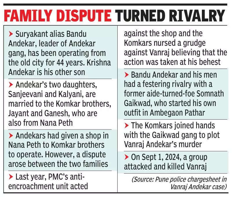 Pune: The Pune police have initiated the process to move the sessions court seeking cancellation of gangster Suryakant alias Bandu Andekar’s bail in 17 criminal cases. This follows the Sept 5 killing of Ayush Komkar (18) in Nana Peth, which was part of a gang rivalry.Ayush’s murder was to avenge Andekar’s son and former NCP corporator Vanraj’s murder in which Ayush’s father Ganesh is one of the 21 jailed accused, police said. Ganesh is married to Kalyani, one of Vanraj’s sisters with whom the former corporator was involved in a property dispute. This resulted in Ganesh joining hands with rival gangster Somnath Gaikwad to kill Vanraj on Sept 1 last year, police said.Deputy commissioner of police (crime) Nikhil Pingale on Monday told TOI: “There are 17 cases registered against Bandu Andekar at various police stations in the city between 1981 and 2023, apart from the present case in which he has been named a key conspirator along with 12 others. So far, Andekar has not been convicted in any of these cases, but in view of Ayush Komkar’s murder, we are asking all the police stations concerned to review individual cases pending against Andekar and initiate a proposal to get his bail cancelled.“There are seven criminal cases registered against Bandu Andekar’s other son, Krishna, between 1981 and 2023, Pingale said. “Three cases have been registered against another family member, Shubham Andekar, between 2016 and 2025,” he added.Joint commissioner of police Ranjan Kumar Sharma said police have arrested one of the shooters, Yash Siddeshwar Patil, and another person, Amit Prakash Patole, in the Ayush Komkar murder case. “Their questioning has revealed that Bandu Andekar is the main conspirator. Andekar along with other conspirators, Krishna and Shubham, are on the run. Once we get Andekar, we will be in a position to unearth the larger conspiracy and establish the role of the co-conspirators among other accused involved in the crime.“Police are collecting proper evidence to make a watertight case against Andekar and others once they are arrested, Sharma said. “We will ensure that they do not get bail for the next few years,” he said.A crime branch officer, who did not wish to be named, said a special MCOCA court in 2023 restrained Andekar from entering Pune district while granting him default bail in the murder case of Navnath Akhade, a member of the Somnath Gaikwad gang. Andekar later shifted his place of residence from Nana Peth to Baramati. A police team conducted searches there, but he fled after he was named as one of the co-accused in the Ayush Komkar murder case, the officer said.Ayush’s last rites were performed at Vaikunth crematorium in Navi Peth amid tight police security. Ganesh Komkar was allowed to attend funeral of his son under police escort and was later sent back to the Yerawada jail. Samarth police had served a notice on the Komkar family that only 25 people should attend the funeral.