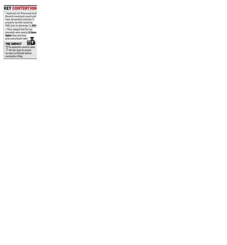 Pune: Aspirants for the upcoming Phursungi-Uruli Devachi municipal council election have called for a reduction in the disproportionately high property tax bills, saying a reduced amount would enable them to settle the dues and obtain the mandatory no-dues certificate required for filing their nominations for the poll.The property tax bills were issued by Pune Municipal Corporation (PMC) prior to the demerger of the two areas from its jurisdiction in 2024. The poll aspirants alleged that PMC’s tax demands were nearly 12 times higher than the rates previously levied by the former gram panchayat.Vishal Harpale, a poll aspirant from the area, expressed concerns over the inflated property tax bills and said, “The administration must reconsider reducing the bills. When our villages were under PMC’s jurisdiction, we received no civic amenities. Imposing such high taxes now is unfair and unjustified.”Civic officials responded that the taxes were levied according to existing regulations. “A special provision from state govt is required to waive arrears or reduce tax liabilities in the merged areas. We haven’t received any such directive yet,” a senior PMC official said.Uruli and Phursungi villages, which were fully merged into PMC in 2017, were demerged in Sept 2024, following demands from the residents for a separate local governing body. The demerger was driven by long-standing issues like lack of water supply, poor roads, inadequate sewage systems and other basic civic services. “The administration must revise and reissue the tax bills. We have struggled for basic amenities, yet we’re being asked to pay higher taxes. The very reason for the demerger was the lack of services, so these charges are unjustified,” Nilesh Pawar, another poll aspirant, said.Avinash Sakpal, head of PMC’s property tax department, was not available for comment till going to press.Another election aspirant, who preferred to remain anonymous, expressed concern that the property tax bills issued by PMC could hinder his plans to contest the upcoming election. “These inflated tax bills must be paid before we can obtain the mandatory no-dues certificate required for filing nominations. If I go ahead and pay the current amount, will I be eligible for any refund or discount later, especially if the bill is revised, considering the demerger with PMC?” the aspirant asked.The election to Phursungi-Uruli Devachi municipal council will be held on Dec 2, followed by the announcement of the results the next day. Of the 14 municipal councils heading to the polls in the district, Phursungi-Uruli Devachi will be voting for the first time since its establishment.GRAPHIC TEXTPMC had proposed merging 34 villages, with 11 merged in 2017 and 23 more in 2021The merger increased PMC’s jurisdiction to 518.77sqkm, making it the largest municipal corporation in MaharashtraThe number of properties in PMC areas increased by 4,00,000Uruli and Phursungi villages were fully merged into PMC in 2017They were, however, demerged last Sept, following residents’ demands for a separate local governing bodyLIKELY REVENUE BOOSTRs 150 crore from 11 merged areasRs 350 crore from 23 merged areas
