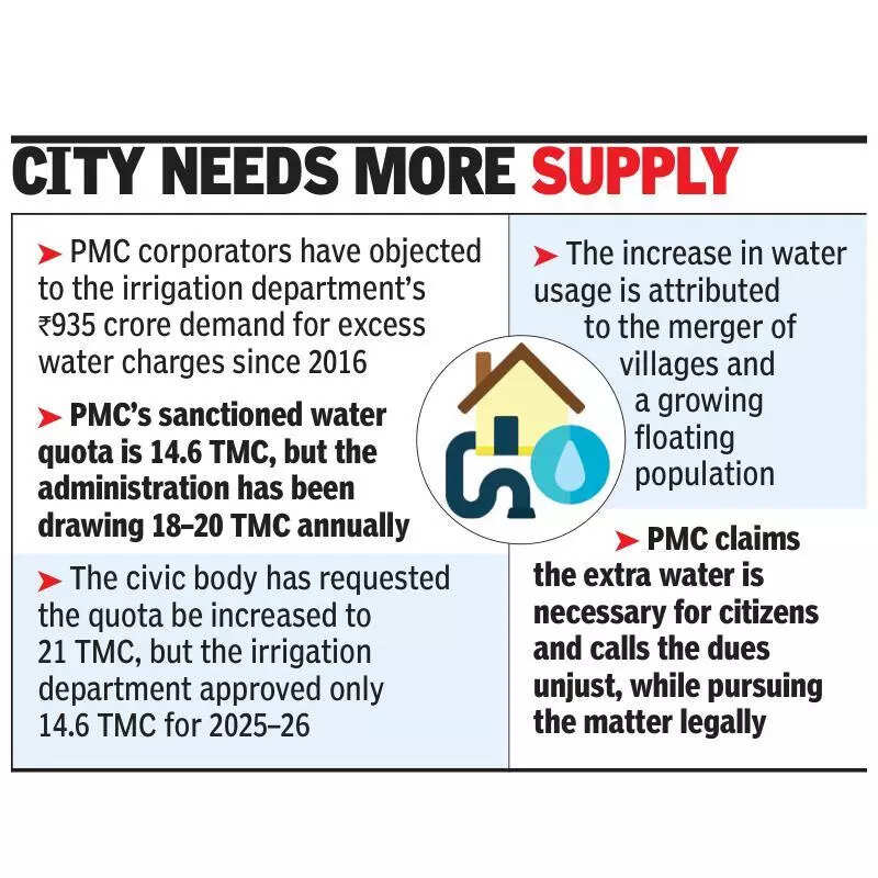 Pune: Newly elected corporators, including those from the ruling BJP, have objected to the irrigation department’s demand of approximately Rs 935 crore in water charges. The department has claimed that the civic body must pay this amount as charges and arrears for drawing water beyond its sanctioned quota since 2016.The allocated quota for Pune Municipal Corporation (PMC) is 14.6 TMC. However, the administration has reportedly been drawing between 18 TMC and 20 TMC of water annually. The civic body attributed the increased usage to population growth following the merger of 32 villages, along with a rise in the floating population. The civic water supply department has sought a revision of the quota, stating that it should be increased to at least 21 TMC.“The administration must make efforts to resolve this issue amicably. The city is expanding rapidly, and so is the water demand. Drawing additional water has become a necessity and is meant solely for the citizens. Discrimination against the citizens of Pune is unjust,” said Nilesh Nikam, leader of the opposition in PMC.PMC’s jurisdiction expanded from 334sqkm to 518sqkm after the merger of 34 villages, making it the largest municipal corporation in the state and surpassing the Brihanmumbai Municipal Corporation (BMC), which covers approximately 440sqkm.“We oppose the demand. The issue will be raised with the state govt. The civic body should not be required to pay these unjust dues. The matter is already being pursued through legal channels,” said Ganesh Bidkar, BJP party leader in PMC.In July 2025, PMC formally requested the irrigation department to sanction a 21 TMC annual water quota for the financial year 2025–26. However, the department approved only 14.6 TMC.“The quota sanctioned by the irrigation department is insufficient. The city’s population has crossed 80 lakh, including a substantial floating population. The water supply must be adequate to meet this demand. PMC is also taking steps to reduce water wastage and leakage. The equitable water supply scheme was introduced to conserve water. Therefore, PMC should be allocated a higher quota,” said a senior PMC official.