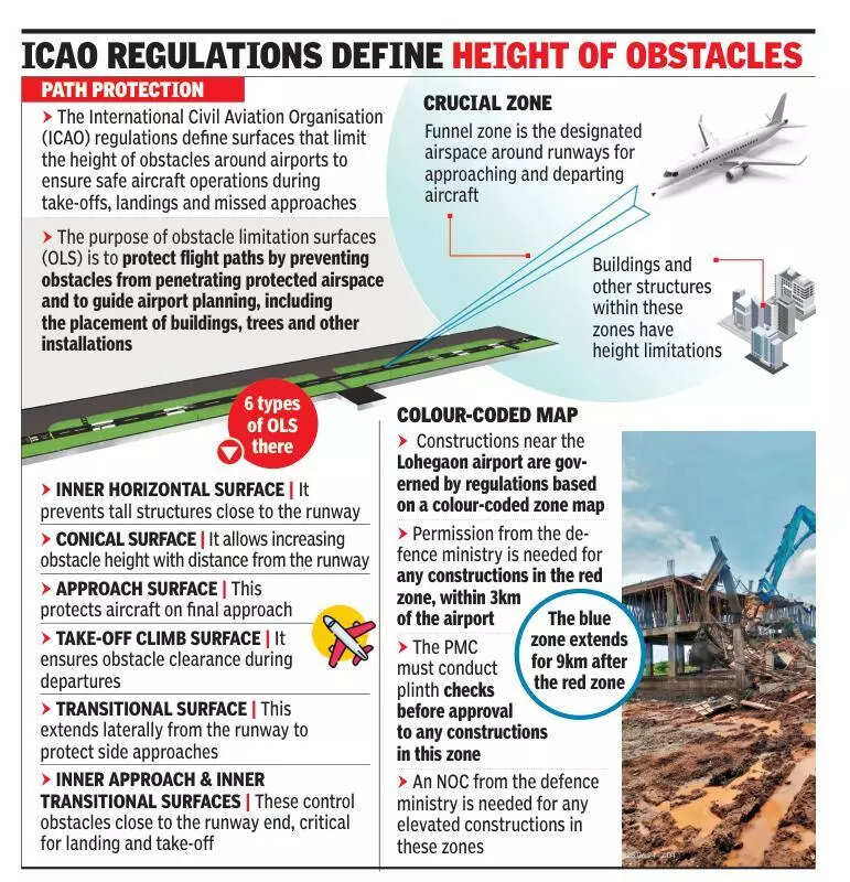 Pune: Civil aviation experts sought more action against rampant and illegal construction activities near Lohegaon airport, citing that flights’ funnel zone was at risk of being compromised.Referring to the Pune Municipal Corporation’s action this week against illegal under-construction buildings in the vicinity of the airport, the experts said too little was being done too late. An Indian Air Force (IAF) veteran, requesting anonymity, said rampant construction around airports couldn’t have happened without collusion.“This is a huge problem. No one is speaking about it. Collusion between law enforcers, builders, politicians and aviation officials may be one of the reasons behind the surge in constructions,” he said.Constructions near the Lohegaon airport are governed by regulations based on a colour-coded zone map. Permission from the defence ministry is needed for any constructions in the red zone, within 3km of the airport. The blue zone extends for 9km after the red zone. The PMC must conduct plinth checks before approval to any constructions in this zone. An NOC from the defence ministry is needed for any elevated construction in these zones.Air Marshal Bhushan Gokhale (retired) said, “When I used to fly from the NDA, all I could see was the Yerawada jail and the mental hospital. Then areas like Kalyaninagar started to develop and the construction is unstoppable now.”He said, “The instrument landing system (ILS) on aircraft and runways is crucial for safe landing of planes. The approach funnel is created in such a way that there is no obstruction in it. No signal should emit via any medium in these areas that can obstruct the ILS. People don’t pay any attention to it.”He said, “In general, the approach funnel caters for a 3° glide slope. When commercial aircraft were allowed to land in Amritsar, some IAF (Indian Air Force) installations had to be removed to make way for the funnel, having lateral and vertical measurements as well.”Gokhale said, “If we look at Lohegaon now, there are establishments like Symbiosis and housing societies towards the lateral sides. So, till what distance is this allowed and how many floors these can accommodate are important to know because once establishments come up, demolition is a big challenge.”The other important aspect is the security part because of these constructions. Gokhale said, “Whether any checks are carried out or not is a question to be asked because builders are happy to sell these structures to anyone without verification. I was in the US Air Force for a year. There is nothing around the airport there for 1km. On the contrary, here we have seen cases when the boundary wall of the IAF station is used as a wall for a house.“PMC has been conducting a door-to-door survey on establishments constructed in different areas near the airport. Rajesh Bankar, a senior official with the building permission department of the PMC, said, “Residents of areas like Lohegaon, Vimannagar and Dhanori areas are not cooperating when asked about the building permission documents. Many of them are not showing the same to our officials. It seems that they are afraid.“An IAF veteran said, “The ICAO (International Civil Aviation Organisation) regulations define surfaces that limit the height of obstacles around aerodromes to ensure safe aircraft operations during take-offs, landings and missed approaches. The purpose of obstacle limitation surfaces (OLS) is to protect flight paths by preventing obstacles from penetrating protected airspace and to guide airport planning, including the placement of buildings, trees and other installations.“Captain Arpit Manshani, a pilot, said too much emphasis was not needed on the approach funnel. IFR (Instrument Flight Rules) approaches are designed for airports after all the obstruction surveys and a lot more by AAI (Airports Authority of India). Once the IFR approach is designed, pilots have access to approach charts.“This means, you don’t have to look out and fly. Refer to instruments inside the cockpit and carry out precision landings. Regarding constructions, one of the requirements is getting an NOC from AAI. Builders somehow get it,” he said.