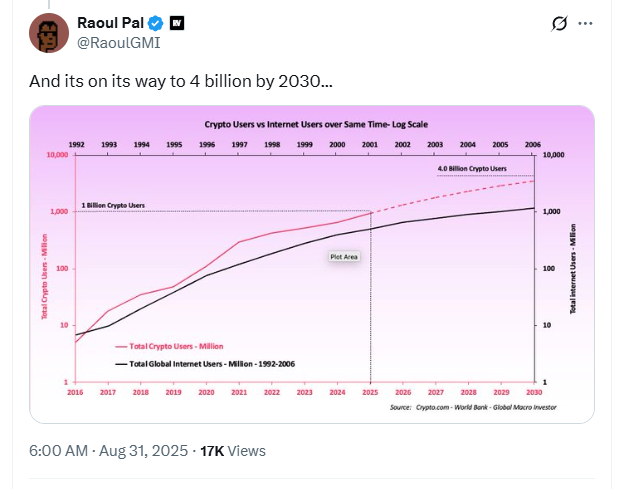 In an X post on Sunday, Pal shared data comparing the adoption rate of crypto users to internet users after each innovation hit 5 million users.
