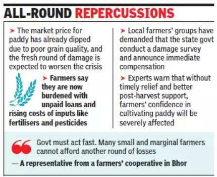Pune: Unseasonal rainfall in the last four days have dashed the hopes of hundreds of paddy growers across Pune district, with farmers in Junnar tehsil reporting severe losses days before harvest.Mahadev Nirmal, a small tribal farmer from Haatvij village, said he will get only half the harvest because rainfall in the last two days has devastated his standing crop. His field was flattened by rain.Paddy growers in Bhor, Velhe, Maval, Mulshi, Khed, Ambegaon, and Junnar tehsils are reporting similar distress, saying that the incessant downpour has caused waterlogging and rotting of ready-for-harvest crops.“This rainfall has come at the worst possible time. The crop was ready for reaping, but water has submerged the fields,” Ramesh Bhosale, a farmer from Velhe, said.District agriculture department officials said they are assessing the loss and will prepare a report for compensation. “The rain has upset the harvest schedule. Farmers are under tremendous stress as their entire earnings depend on this crop. We are assessing the ground situation,” district agriculture officer Sanjay Kachole told TOI.Pune district is among Maharashtra’s top five paddy-producing regions, known particularly for the aromatic Indrayani variety — a staple in local households and widely used by hotels and restaurants in and around Pune and Mumbai. However, the back-to-back spells of unseasonal rain threaten to disrupt not just farmers’ livelihoods but also the local rice supply chain.India Meteorological Department (IMD) forecast for more rainfall over the next few days has caused more worry to farmers. Agricultural experts warn that the continuous wet spell could lead to fungal infections in the grain and make mechanical harvesting impossible in waterlogged fields. Farmers say the double blow — weather damage and plummeting market prices — has left them staring at heavy financial losses.In Bhor taluka, farmers who had just completed paddy harvesting are now struggling to dry their produce. The moisture has damaged large quantities of grain, making them unsuitable for sale. “We had a good crop this year, but the rain at harvest time has spoiled everything. The grains have blackened and started rotting,” a farmer from Hirdoshi village said.Agricultural officers confirmed that several areas, including Hirdoshi, Wadvad, Hirdoshi Khurd, and other surrounding villages, have reported fungal infection and rotting due to dampness. “Moisture during harvest causes discolouration and reduces grain quality. Farmers will now have to sell their produce at much lower rates,” an official said.In Mulshi taluka, the situation is no better. Persistent cloudy conditions and heavy rain have delayed harvesting operations. Many farmers were forced to keep their crops in the field longer than usual, increasing the risk of further damage. “We were expecting a bumper harvest after a good monsoon. But the weather turned unfavourable just when we were about to reap the benefits,” Rajaram Jadhav, a farmer from Ghusri village, said.All-Round Repercussions The market price for paddy has already dipped due to poor grain quality, and the fresh round of damage is expected to worsen the crisisFarmers say they are now burdened with unpaid loans and rising costs of inputs like fertilisers and pesticides.Local farmers’ groups have demanded that the state govt conduct a damage survey and announce immediate compensationExperts warn that without timely relief and better post-harvest support, farmers’ confidence in cultivating paddy will be severely affectedquote Govt must act fast. Many small and marginal farmers cannot afford another round of lossesA representative from a farmers’ cooperative in Bhor
