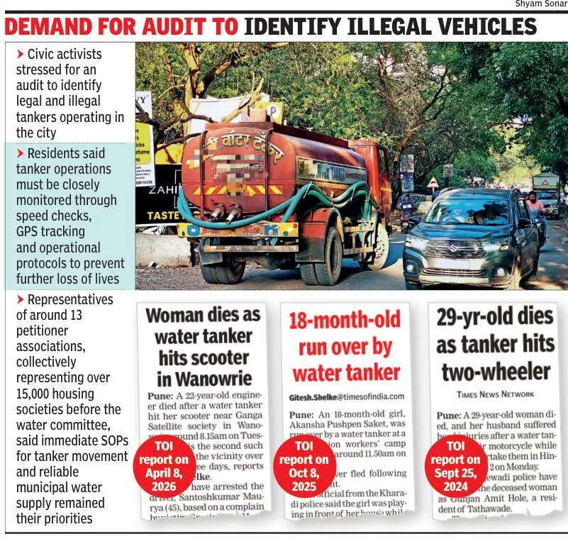 Pune:Immediate SOPs and their strict implementation are residents’ antidotes for reckless tanker driving.Housing societies in NIBM-Undri and Wanowrie areas demanded strict standard operating procedures (SOPs) to regulate tankers’ movement, after two recent fatal accidents involving private water carriers. Their representatives said tanker water supply was essential for them but authorities must immediately introduce SOPs to regulate tankers’ movement. They stressed on strict monitoring of tanker operations and road safety awareness among operators.Two youngsters – Pargenagar’s Aariz Shaikh (19) and Wanowrie’s Gracia Daniel Isa (22) – were killed after separate water tankers hit their two-wheelers on NIBM-Raheja Vista Road and near Ganga Satellite society in Wanowrie on Sunday and Tuesday, respectively.The reckless tanker driving issue was discussed multiple times in water committee meetings, held to review the water availability in Pune, Pimpri Chinchwad and areas under Pune Metropolitan Region Development Authority (PMRDA). The high court directed regular water committee meetings to address tanker dependence and water supply gaps after some housing societies filed a PIL over worsening urban water shortage.Satya Muley, the lawyer representing the housing societies in the PIL and coordinating water committee meetings on their behalf, said tanker movement had increased manifold because of summer scarcity and SOPs must be implemented without delay. “We have repeatedly advised the PMC (Pune Municipal Corporation) and other local bodies that tanker water supply is essential, but SOPs must be put in place to regulate tankers’ movement, ensure proper monitoring of operations and implement speed checks for safety,” he said.He said the issue was highlighted in a water committee meeting even a year ago. Authorities were advised to conduct a census of private tankers, identify and record water sources, introduce water quality checks and regulate tanker operations, but the implementation is still pending.Sunil Kaloti of Mohammadwadi Undri Residents Welfare Development Foundation said, “It is a Catch-22 situation. Residents in Mohammadwadi and Undri are largely dependent on tankers for water, but these must operate under strict monitoring with GPS tracking and speed limits. Repeated rash and drunk driving by tanker operators have been reported. We plan to approach traffic police and seek data on tanker hit-and-run deaths in the recent past for stricter action.“Jaymala Dhankikar, a resident of Ganga Kingston Society in NIBM Annex and a civic activist, said, “There is no proper record or verification of drivers operating these tankers. The accident where a tanker driver, allegedly drunk, killed a 19-year-old highlights the seriousness of the issue.”She suggested that the administration consider restricting the movement of water tankers during the daytime. “They should ideally be allowed to operate only at night when the traffic is minimal,” Dhankikar said.NitinD’souza, a resident of Archana Paradise society and another civic activist, said narrow roads and rampant encroachments had made commuting difficult. “There is barely any space left for vehicles, let alone pedestrians. Tanker drivers frequently violate traffic rules and engage in rash driving. We recently caught a driver who didn’t even have a valid licence,” D’souza said.Highlighting the larger concern, Dsouza said residents had little option but to depend on private water tankers because of lack of adequate municipal supply.“Even as the civic body continues to approve new projects, there is no water supply in the area. As a result, housing societies are forced to spend lakhs of rupees on tankers, and the movement of these heavy vehicles is increasing day by day, increasing the risk of accidents,” he said.Naveen Sharma, a resident of Wanowrie, said water tankers headed towards Undri and the NIBM area were frequently driven recklessly. “The traffic police and authorities concerned must take strict action, only then can accidents involving these heavy vehicles be prevented,” he said.