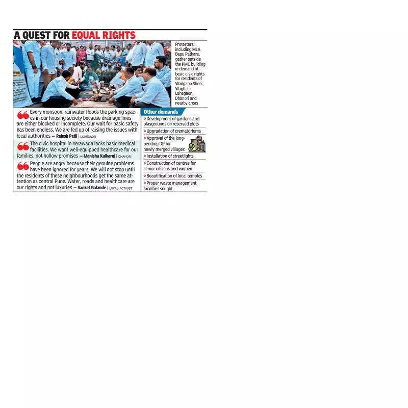 Pune: Residents of eastern parts of Pune like Wadgaon Sheri, Wagholi, Lohegaon, Dhanori and nearby areas protested outside the Pune Municipal Corporation (PMC) building on Tuesday and approached civic chief Naval Kishore Ram demanding improved infrastructure — the absence of which had crippled their daily lives for years.The people gathered at PMC headquarters sought regular water supply, completion of pending roads, improvement of the drainage system and upgraded healthcare facilities. They urged for development of garden spaces, streetlights and approval of village development plans.The protesters said civic neglect had crossed all limits of tolerance. They submitted a list of grievances to Ram, who assured them that complaints would be reviewed seriously and addressed through departments concerned.The top demands included water supply for a minimum two and half hours daily as is the case in most parts of Pune, completion of stalled water tank projects and extension of the Bhama Askhed pipeline to Wagholi to address acute shortages. The residents highlighted daily traffic chaos on Wagholi–Lohegaon Road, Symbiosis Road and Ahilyanagar Road and called for urgent completion of pending roadwork and pothole repairs.Many expressed frustration over severe civic lapses. “We pay taxes like everyone else in the city, but our roads have craters and we have to buy drinking water at high rates. The supply is so irregular in our societies that we no longer rely on PMC’s distribution network,” said Neha Jadhav of Wagholi.Rajesh Patil of Lohegaon said, “Every monsoon, rainwater floods our housing society’s parking spaces because drainage lines are either blocked or incomplete. Our wait for basic safety has been endless. We are fed up of raising issues with local authorities.”Manisha Kulkarni of Dhanori said, “The civic hospital in Yerawada lacks basic medical facilities. We want well-equipped healthcare for our families, not hollow promises.”Local activist Sanket Galande said, “People are angry because their genuine problems have been ignored for years. We will not stop until residents of these neighbourhoods get the same attention as central Pune. Water, roads and healthcare are our right and not luxury.”Protestors also called for development of gardens and playgrounds on reserved plots, upgradation of crematoriums, approval of the long-pending development plan for newly merged villages, installation of streetlights, construction of centres for senior citizens and women, beautification of local temples and proper waste management facilities.PMC officials who met the delegation said the administration had taken note of the grievances. Ram said, “The petition will be reviewed on priority. Departments concerned will take up necessary works to address the issues raised.”