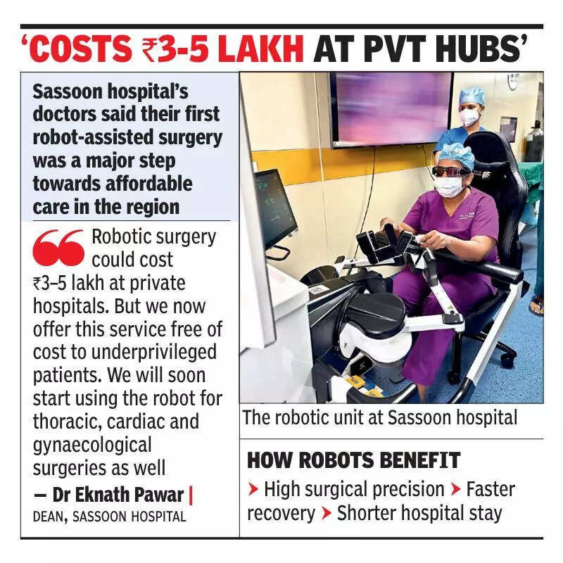 Pune: A 35-year-old woman, who had gallstones, has become the first patient to undergo a robot-assisted surgery at the city’s BJ Medical College and Sassoon General Hospital (BJMC & SGH). The successful procedure, performed free of cost on Wednesday, made the hospital the first govt medical college in western Maharashtra and the third in the state to have a dedicated robotic surgery facility for the masses, after Mumbai’s King Edward Memorial Hospital and Nagpur’s Government Medical College. The woman who underwent the surgery on Wednesday, for what’s known as cholelithiasis (gallstones in the gallbladder), is expected to be discharged on Sunday, her doctors said. Dr Lata Bhoir, head of general surgery department, said: “The patient had abdominal pain for 5-6 months and was diagnosed with gallstones, medically termed as cholelithiasis. We performed a cholecystectomy, or the removal of gallbladder. She’s doing fine.” A keyhole incision was made rather than a long continuous incision, which helps minimise blood loss and expedites post-surgery recovery, Dr Bhoir added.Sassoon’s robotic unit took months to start. The robot was purchased last November by the medical education department, but could only be used this week – eight months later – due to various reasons, including renovations in the operating theatre and crucial training for surgeons. Sassoon hospital’s surgeons and nurses, rated to operate the robot, were trained at Nagpur Government Medical college. A high-fidelity simulator was used to develop their skills.Dr Eknath Pawar, dean of BJMC & SGH, hailed Wednesday’s surgery as a big step towards affordable care. “Robotic surgery may cost Rs3–5 lakh at private hospitals. But our hospital now offers this service free of cost to underprivileged patients,” he said, adding that the robot can help surgeons improve reach.Dr Pawar said: “While a surgeon has only two arms and limited wrist movement, three to five arms of the robot can operate simultaneously and much more efficiently under the control of the surgeon. This can be helpful for organs that are difficult to access by open or laparoscopic surgery, which includes procedures on the prostate, adrenal gland kidney and oesophagus. SGH will soon start using the robot for thoracic, cardiac and gynaecological surgeries as well.“Dr Aashish Chavan, associate professor, of the general surgery department said: “Robotic surgery is an advanced technique where a significant part of the body cavity surgery is done by a robotic arm, controlled by a surgeon sitting at the computer console away from the patient in the operation theatre. It has many advantages, including access to difficult areas, better vision, reduced blood loss and faster recovery.“