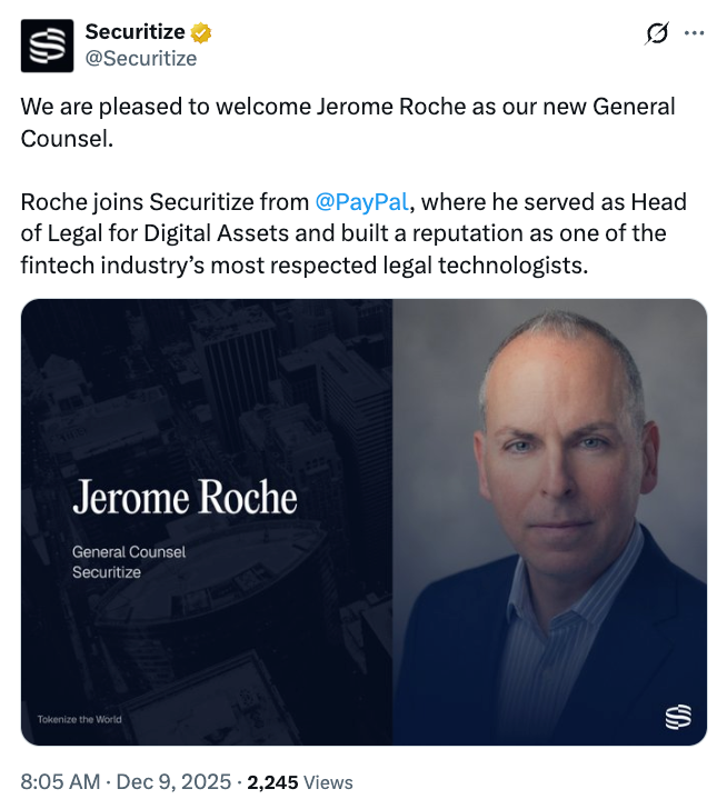 Securitize on Tuesday announced the appointment of ex-PayPal executive Jerome Roche, who led the company’s expansion into digital asset projects, including the PayPal USD (PYUSD) stablecoin.