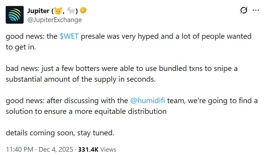 “We are creating a new token. All Wetlist and JUP staker buyers will receive a pro-rata airdrop. The sniper is not getting shit,” HumidiFi wrote. “We will do a new public sale on Monday.”