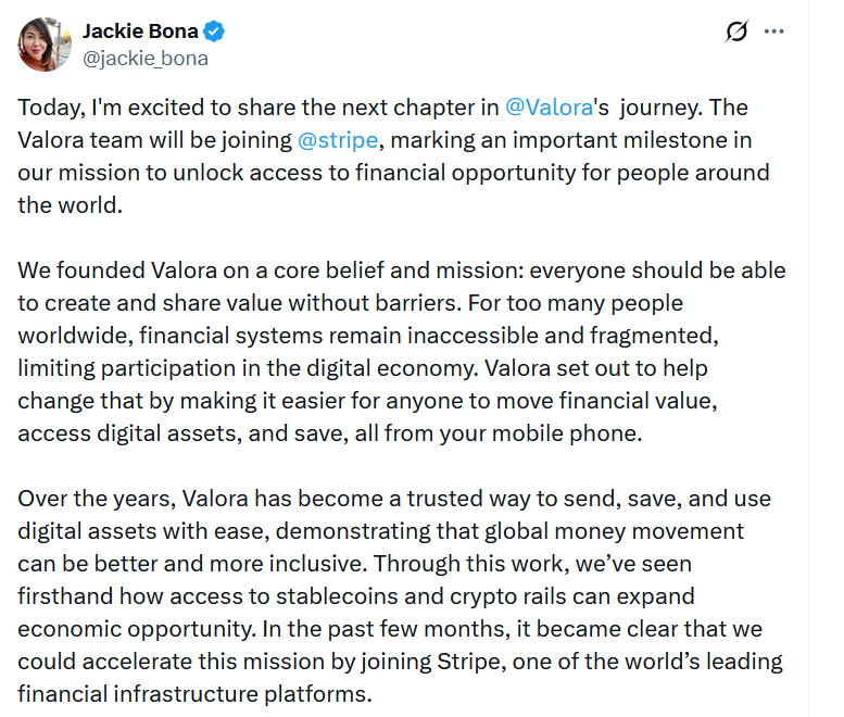 “Stripe shares our conviction that stablecoins and crypto can dramatically expand who gets to participate in the global economy,” said Bona, adding that “by bringing Valora’s team to Stripe, we’ll be able to contribute our expertise in web3 and user-first experiences to a platform with unparalleled reach.”