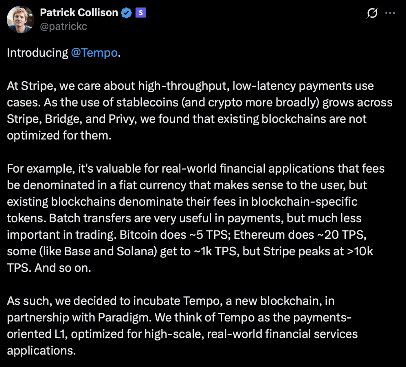 On Sept. 4, Stripe CEO Patrick Collison wrote on X, “as the use of stablecoins (and crypto more broadly) grows across Stripe, Bridge, and Privy, we found that existing blockchains are not optimized for them.”