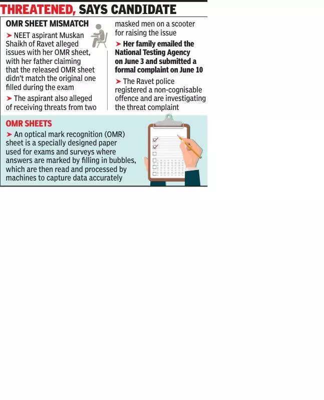 Pune: Baramati MP Supriya Sule on Wednesday questioned NEET’s credibility after a Pimpri Chinchwad aspirant alleged OMR sheet tampering and discrepancies in her details. Sule, via a social media post, also demanded a thorough probe and strict action against those responsible in the case.NEET aspirant from Ravet Muskan Shaikh filed a non-cognisable offence with the Ravet police June 8 after two masked men on a scooter allegedly threatened her against raising the issue. Taking to social media platform X, Sule posted: “Such incidents raise grave concerns about the transparency and integrity of an examination as important as NEET. If students’ answer sheets are manipulated in this manner, it puts their future at stake and casts a shadow on the credibility of the entire examination process.“Muskan’s uncle, Salim, told TOI that they emailed the National Testing Agency (NTA) regarding the issue on June 3 and submitted a formal complaint to its New Delhi office on June 10. Muskan’s father, Vasim, alleged in the complaint that the OMR sheet released by NTA didn’t match the original one filled during the exam. He requested corrections be allowed before the final results.NEET for 2025 were conducted on May 4. The NTA released the provisional answer key and OMR sheets for candidates on June 3, with a deadline to submit objections before June 5. The results will be announced on June 14.Muskan, in her complaint to Ravet police, stated that she was threatened by two men around 6.45pm on June 8 at Adarshnagar when she went out cycling. According to her complaint, the men riding on a black scooter threatened to kill her and family members if they raised the issue about the OMR sheets. Earlier, a video made by Muskan’s father explaining the issue his daughter faced was circulated on social media platforms.Senior inspector Nitin Phatangare of the Ravet police told TOI, “We have registered a non-cognisable offence in the matter. The CCTV footage around the area was checked. Further investigation is underway.” He said they were only investigating the threat complaint. “My daughter also appeared for the exam last year (2024), but since it was her first attempt, she did not succeed. This time, however, she studied hard and was confident of securing 645 to 650 marks,” Vasim said, adding that they also submitted a written complaint to the Chinchwad police as the exam was conducted at a college in their jurisdiction.NTA director general Pradeep Singh Kharola was not available for comment despite calls and messages till going to press.