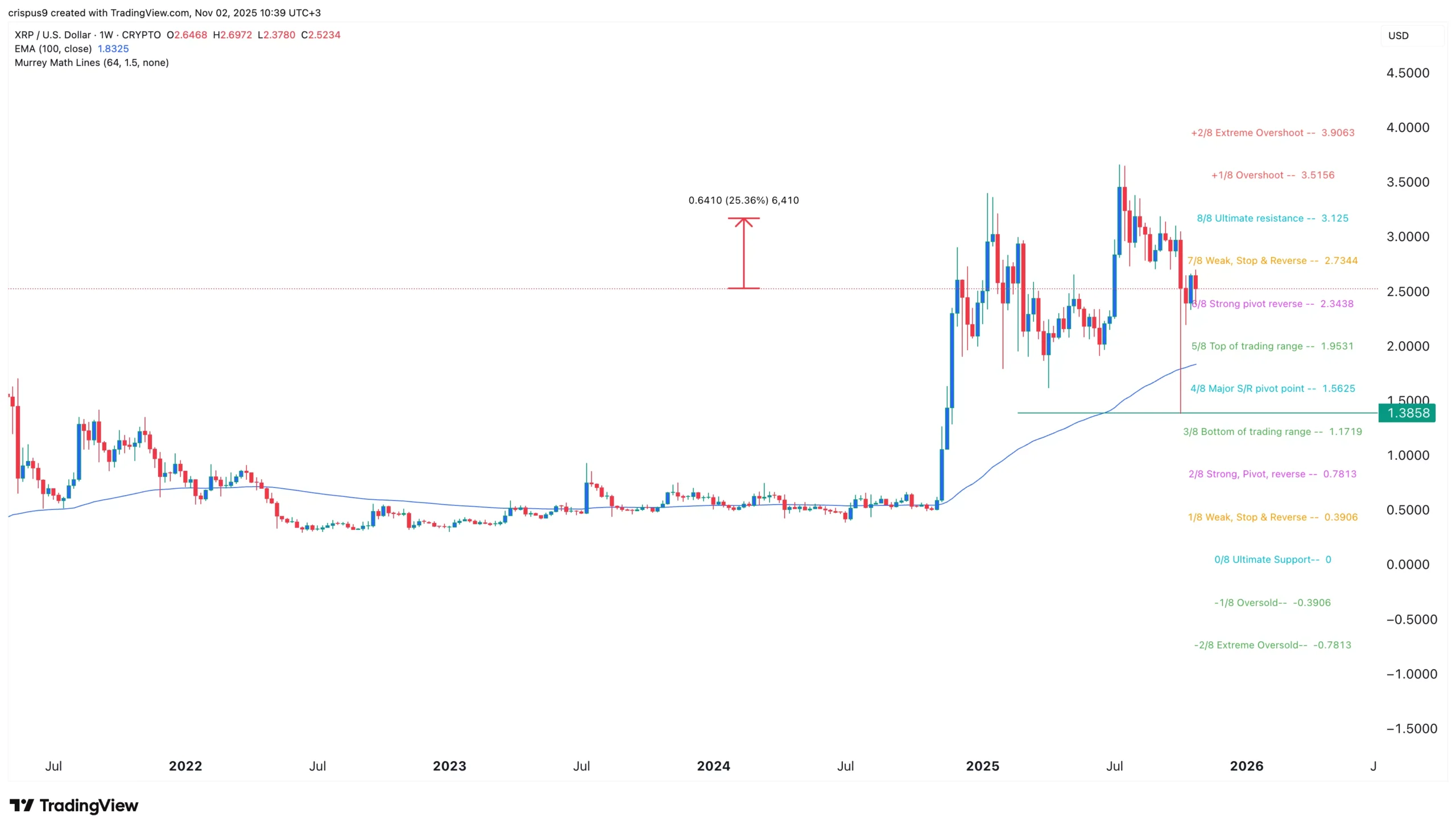 The weekly timeframe chart shows that the XRP price has bounced back from a low of $1.3858 in October to its current level of $2.52. It has formed a hammer candlestick pattern, which is a typical bullish reversal pattern.