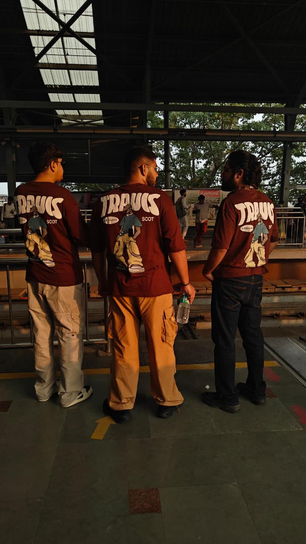Three fans await the metro to JLN Stadium ahead of Travis Scott’s Circus Maximus concert in Delhi on October 18, 2025