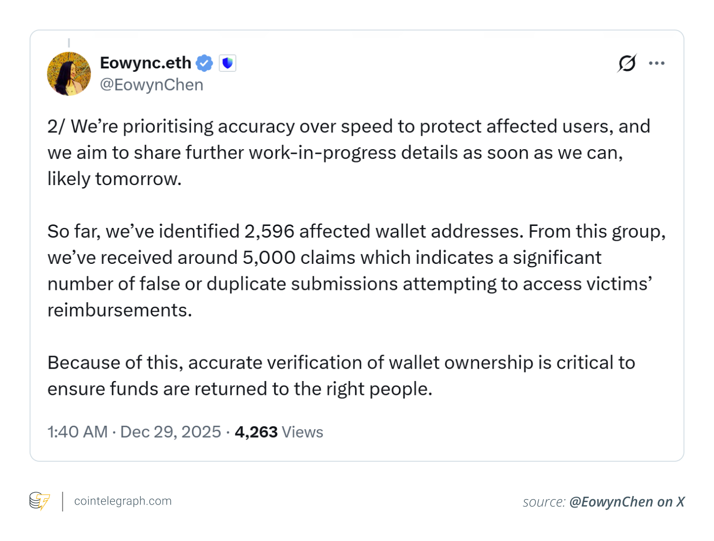 A key insight from the Trust Wallet hack became apparent during the post-attack phase. Nearly 5,000 claims were submitted for just over 2,500 affected addresses, highlighting the risk of duplicate, incorrect or fraudulent submissions.