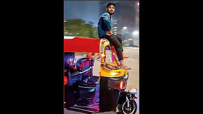 Navi Mumbai: Turbhe police have booked two men for performing stunts on a moving auto rickshaw. While one of them is seen sitting atop the auto without a driver, the other was making a reel. Police learnt about the incident after the reel was posted on social media. The duo, Shamshud Ahmed (27) and Akshay Dhotre, have been booked under BNS and Motor Vehicles Act. — George Mendonca