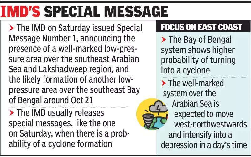 Pune: The IMD on Saturday announced the presence of a well-marked low-pressure area over the southeast Arabian Sea and Lakshadweep region, and the likely formation of another low-pressure area over the southeast Bay of Bengal around Oct 21 showing higher probability of turning into a cyclone. According to India Meteorological Department (IMD)’s Special Message Number 1, the system over the Arabian Sea formed early Saturday morning. The well-marked system is expected to move west-northwestwards and intensify into a depression in a day’s time. The second system is expected to form over the Bay of Bengal in the next three days. It could strengthen into a depression over the central parts of south Bay of Bengal and adjoining west-central parts of the Bay soon. While the IMD has not yet indicated the likelihood of cyclones, independent weather experts suggested that both systems had the potential to intensify further into cyclones. The IMD usually releases special messages, like the one on Saturday, when there is a probability of a cyclone formation. A senior IMD official said, “An Arabian Sea cyclone does not seem that probable, although we have indicated the chances of a well-marked low pressure and its intensification into a depression soon. The Bay of Bengal system may turn into a depression. By Sunday, we should have more clarity. The Bay of Bengal system does have a high probability of turning into a cyclone.”Skymet Weather Services president G P Sharma said, “The Bay of Bengal system is likely to be stronger than the Arabian Sea system. The latter may not affect our coastline significantly, except for bringing rain over Kerala and coastal Karnataka. The Bay of Bengal system, on the other hand, is likely to be more powerful and may even move towards the Tamil Nadu coast, though it’s still a little early to say. The Bay system may impact our region more and is likely to intensify rapidly. Usually, such systems at that latitude have a history of moving across the southern peninsula towards the Arabian Sea and can eventually head towards the Gujarat coast. As of now, these are the early indications.”Another Skymet Weather Services official said, “The depression over the Arabian Sea will move northwestwards, away from the Indian coast, but could bring isolated heavy rain to Lakshadweep and Kerala. The Bay of Bengal system may head towards the south Andhra Pradesh and north Tamil Nadu coast by October 23. Both have the potential to become cyclones, though clarity will emerge once they intensify into depressions.” The IMD has issued a yellow alert for parts of Maharashtra, including the Western Ghats and Pune district, forecasting light to moderate rain or thundershowers in the coming days because of the influence of the Arabian Sea system. Weather models suggest that while the Arabian Sea disturbance would remain at a safe distance from the Indian coastline, its presence is likely to bring intermittent rain and thundershowers over Kerala, coastal Karnataka, Konkan and Goa in the coming days. Officials said further updates would depend on how both systems evolve over the weekend, with more clarity expected once the Bay of Bengal disturbance formed and the Arabian Sea system intensified into a depression.