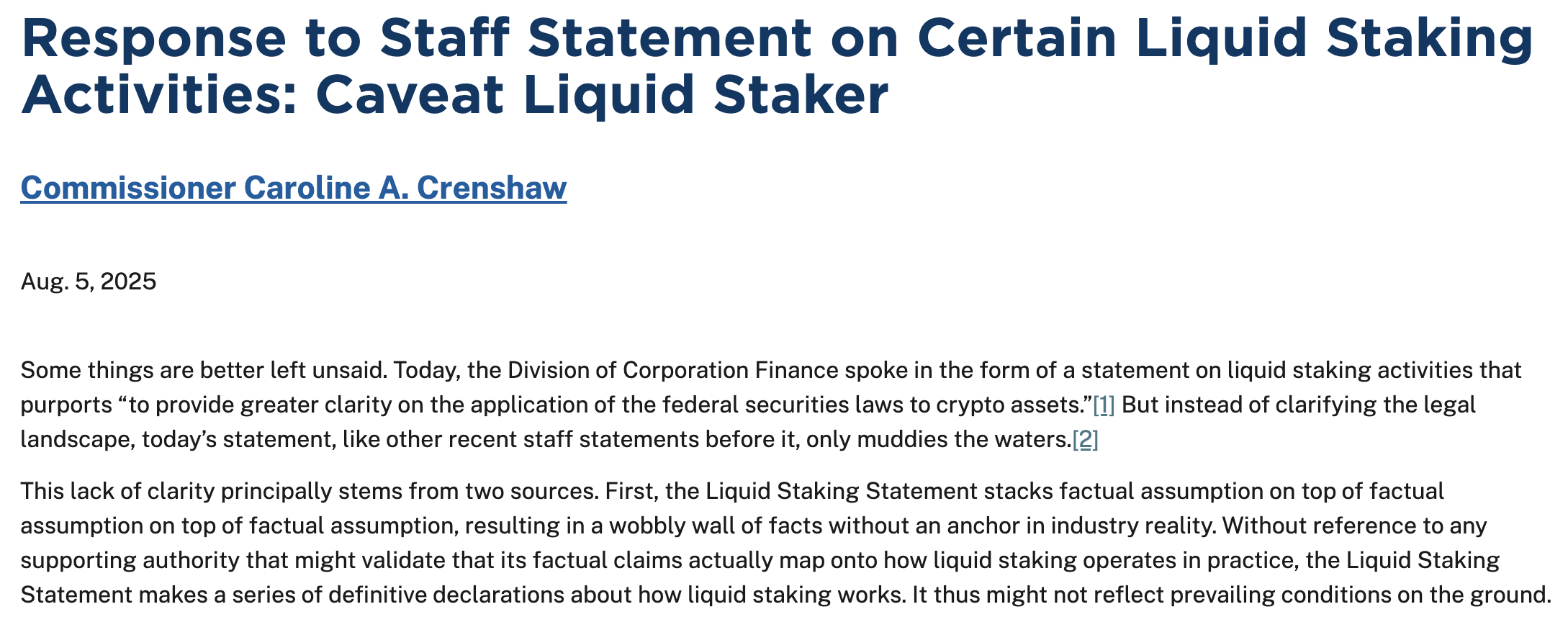 Crenshaw said the statement creates a “wobbly wall of facts without an anchor in industry reality,” warning liquid staking entities to proceed cautiously: “Caveat liquid staker.”