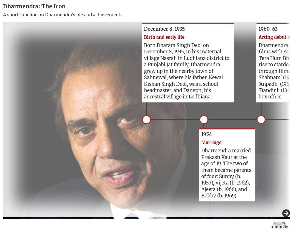 The actor is survived by his wives Prakash Kaur and Hema Malini, sons Sunny and Bobby Deol, and daughters Vijeta, Ajeeta, Esha and Ahana.